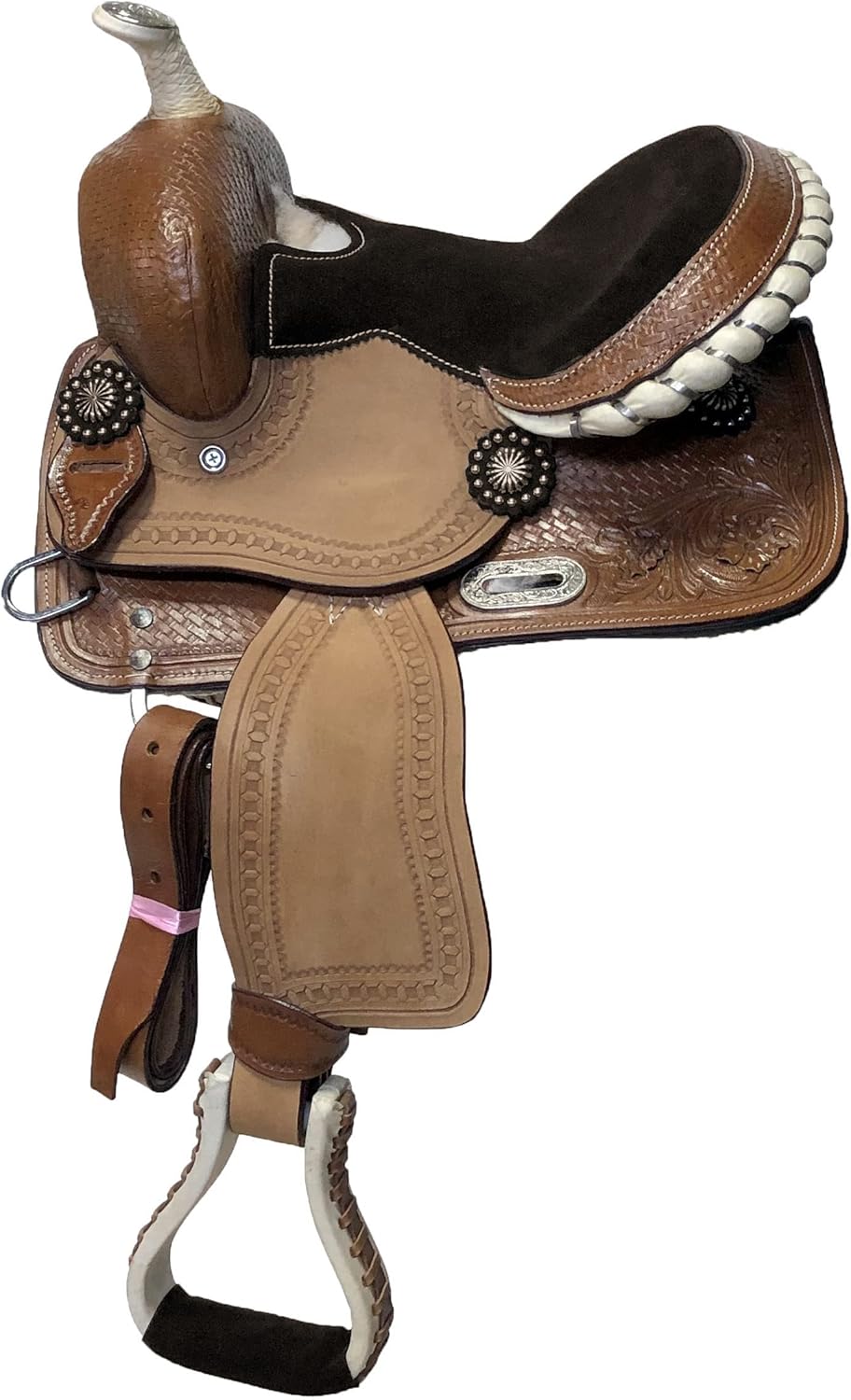 10" YOUTH Tooled Leather Western Pony/Horse Saddle FEATURES: 10" Suede Seat, Skirt: 16"L x 17" W, Pommel: 10 W, Cantle: 4", Horn: 2", Gullet: 5", Stirrups: 22"- 26" Length, Made on a Sturdy Fiberglass tree. SEMI Quarter Horse Bars.