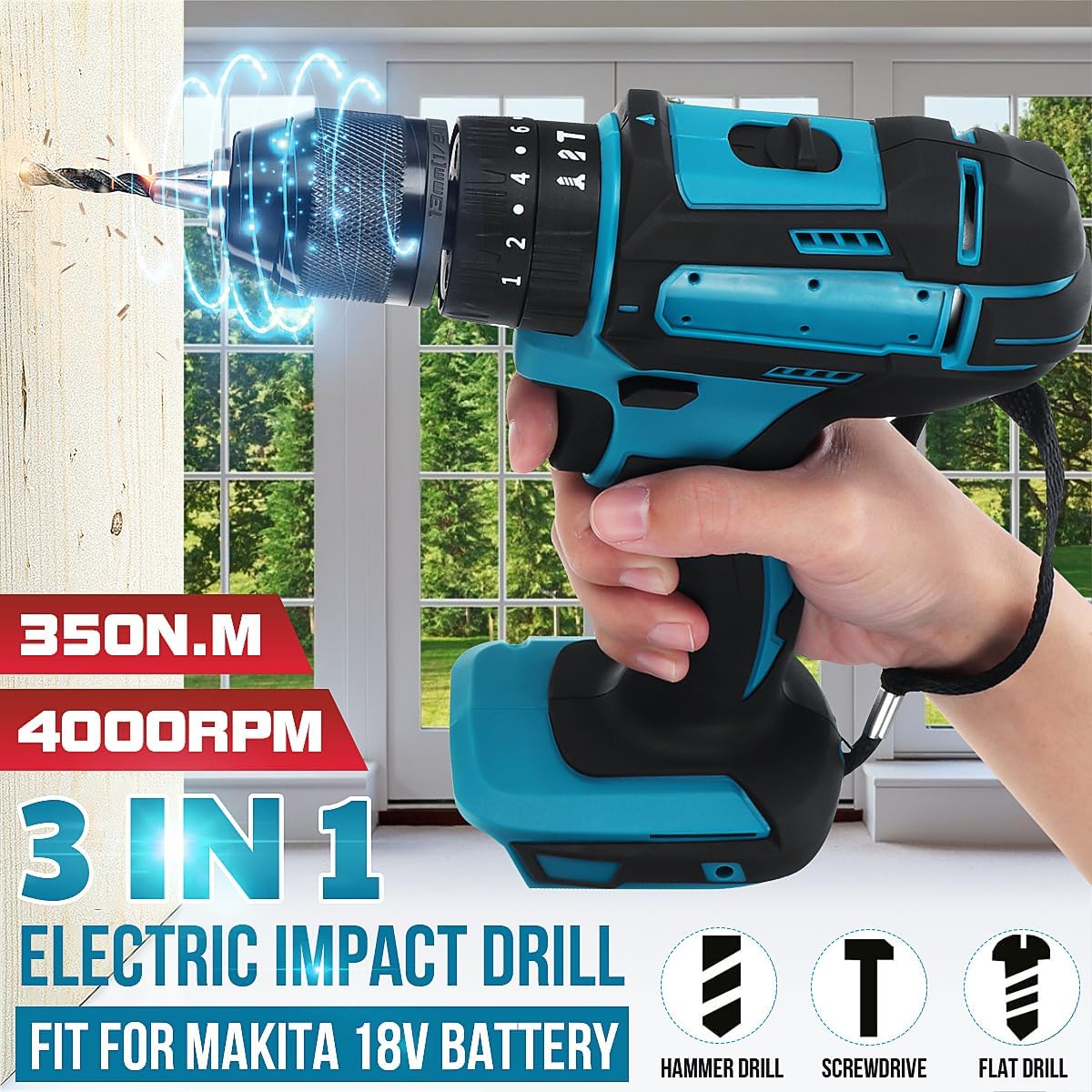 Features: - Flat drill function/Hammer funtion/Screwdriver function. - Built in LED working light, provides illumination in dark spaces as you work. - Ergonomic comfort handle provides ideal balance and tool control. - Forward / reverse / lock switch, support forward / reverse driving and safe locking. Specifications: Name: Electric drill Color: Blue+Black Max. Torque: 350N.m No Load Speed: 4000 rpm Chuck Size: 10mm Replacement Battery Type: Replace for M 18V Battery(Not included)