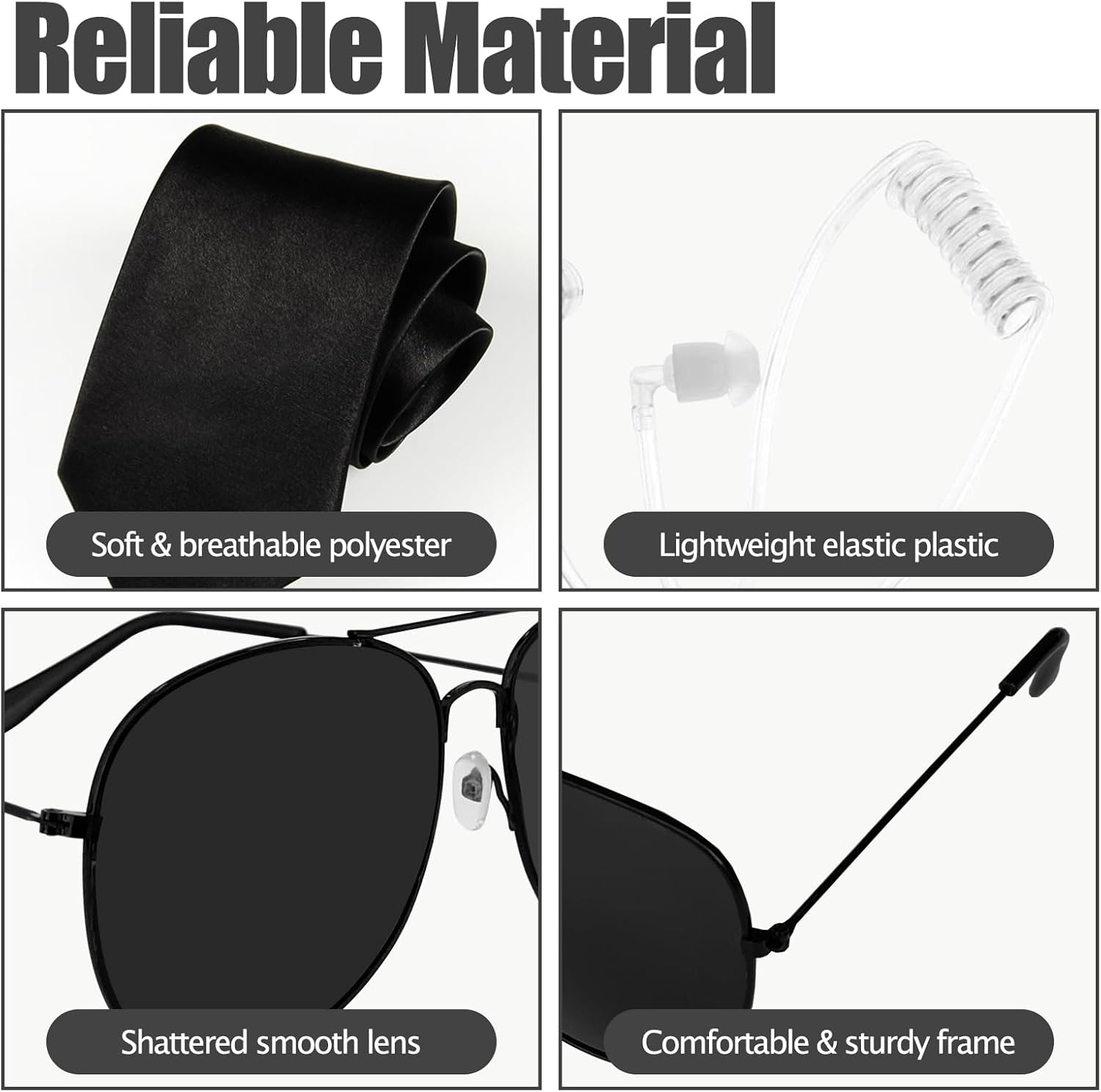 Specifications: Material:Polyester,plastic. Package Including:Sunglasses x2,neck hanging ID card x2,tie x2,headphone x2,card holder x2. Size: Tie length:17.3 in/44 cm. Sunglasses:5.7 x 5.5 in/14.5 x 14 cm. ID card:2.8 x 4.3 in/7 x 11 cm. Hanging rope:15.7 in/40 cm. Wide Range of Applications: Surprise friends,family,or colleagues with this eye-catching agent service cost set! Agent costume accessories are perfect for stage performances,carnivals,festivals,or everyday wear. Secret security accessory makes you the center of attention at Halloween,birthdays,and themed parties.