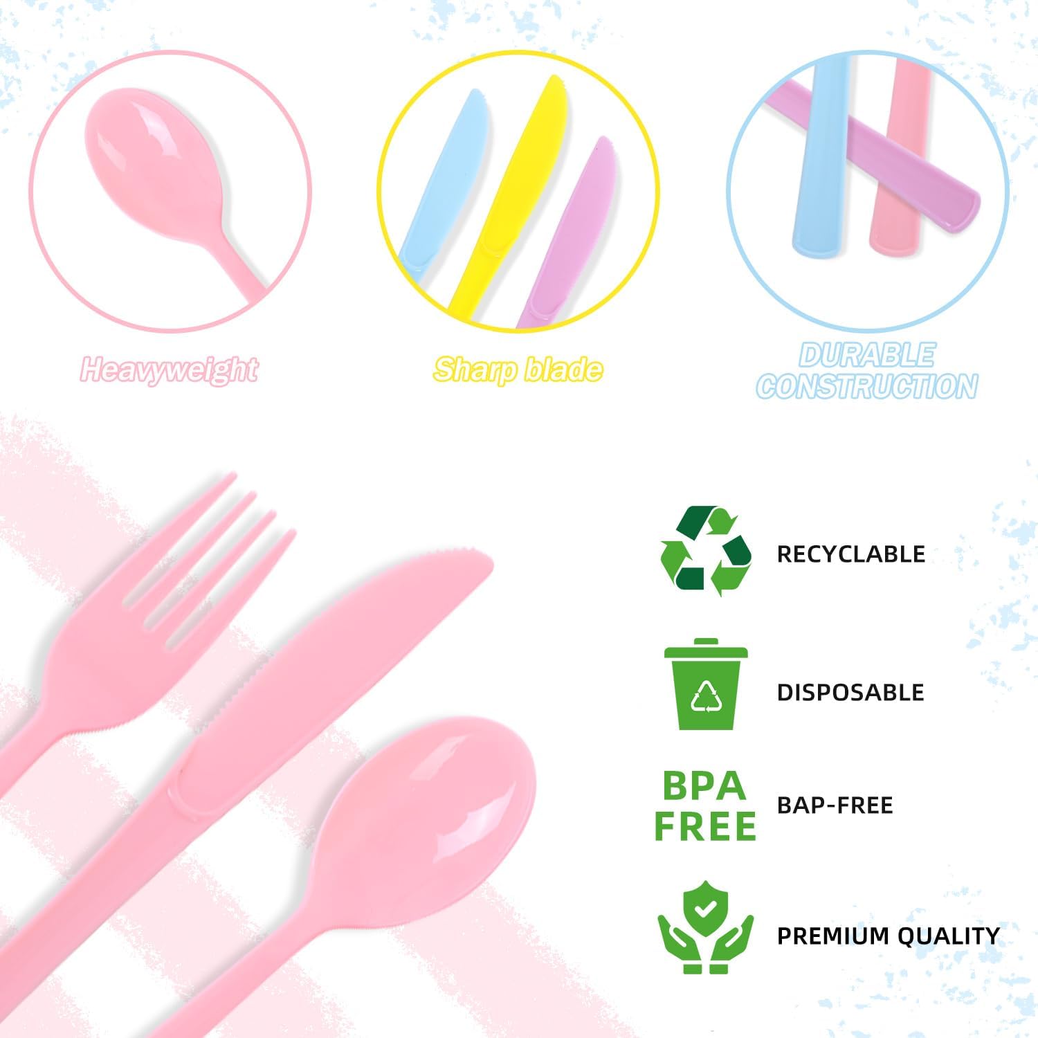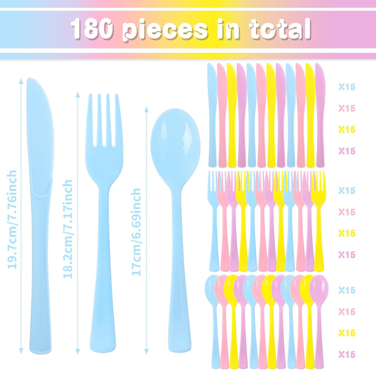 Brand: FULJOOY Number of Pieces: 180 Material: PS plastic Color: Pastel Rainbow Product Care: Instructions Hand Wash Only Recommended: Uses For Product Outdoor Special Feature: Portable Included Components: 60 spoons, 60 forks, 60 knives Style: Casual Is Stain Resistant: No