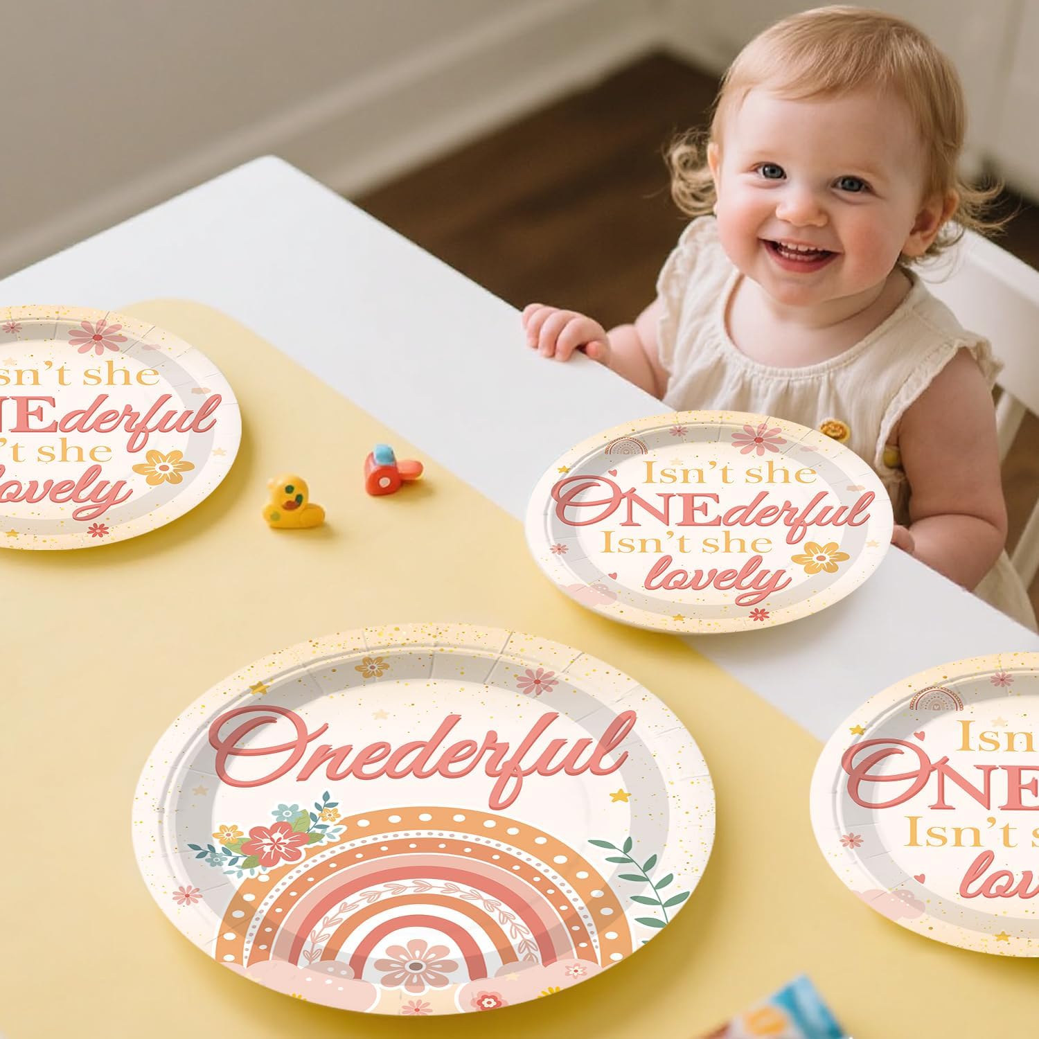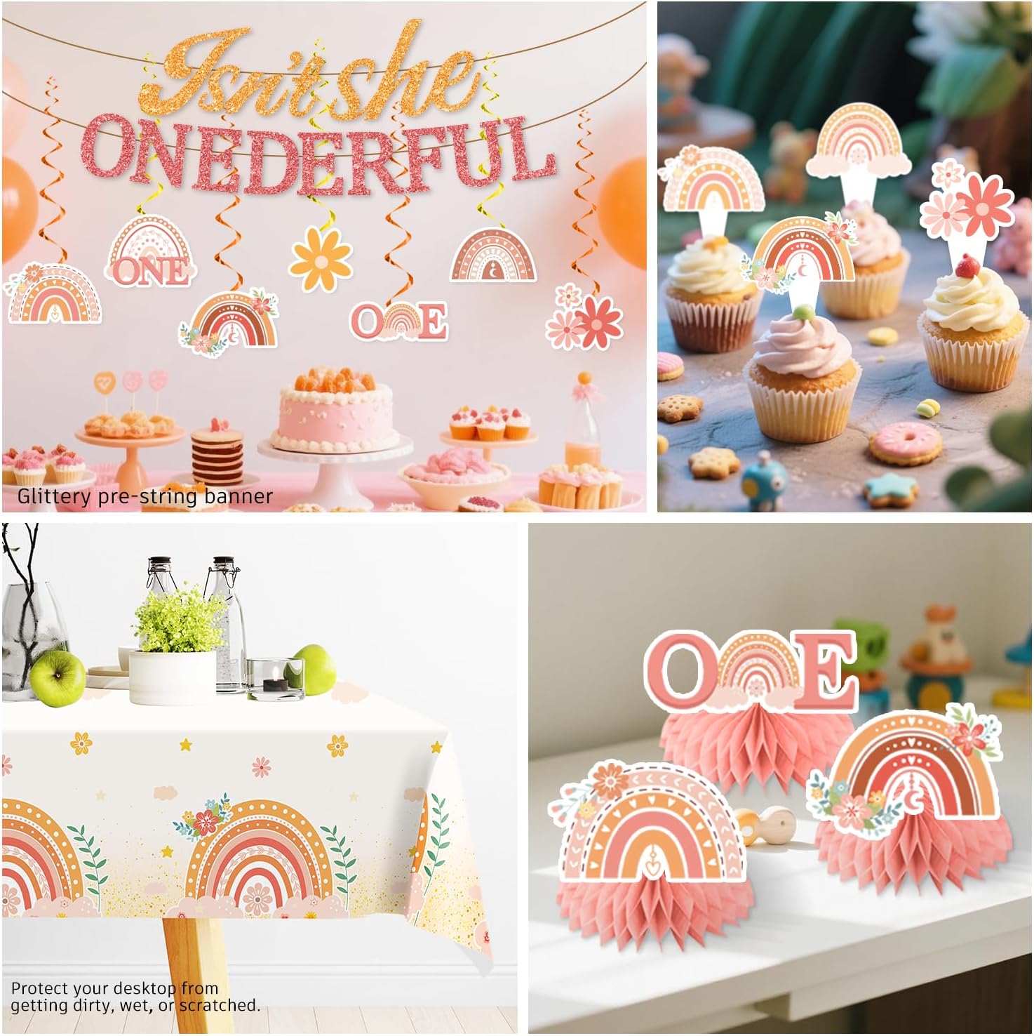 | Included Components | 1 x girl first birthday cake topper, 12 x 1st birthday cupcake topper, 1 x isn't she onederful birthday banner, 8 x isn't she lovely birthday hanging swirls, 16 x isnt she onederful balloons, 3 x honeycomb centerpieces, 2 x isnt she lovely table cloths, 25 x 7 inch paper plates, 9 inch dinner plates, forks, straws, napkins, and cups |