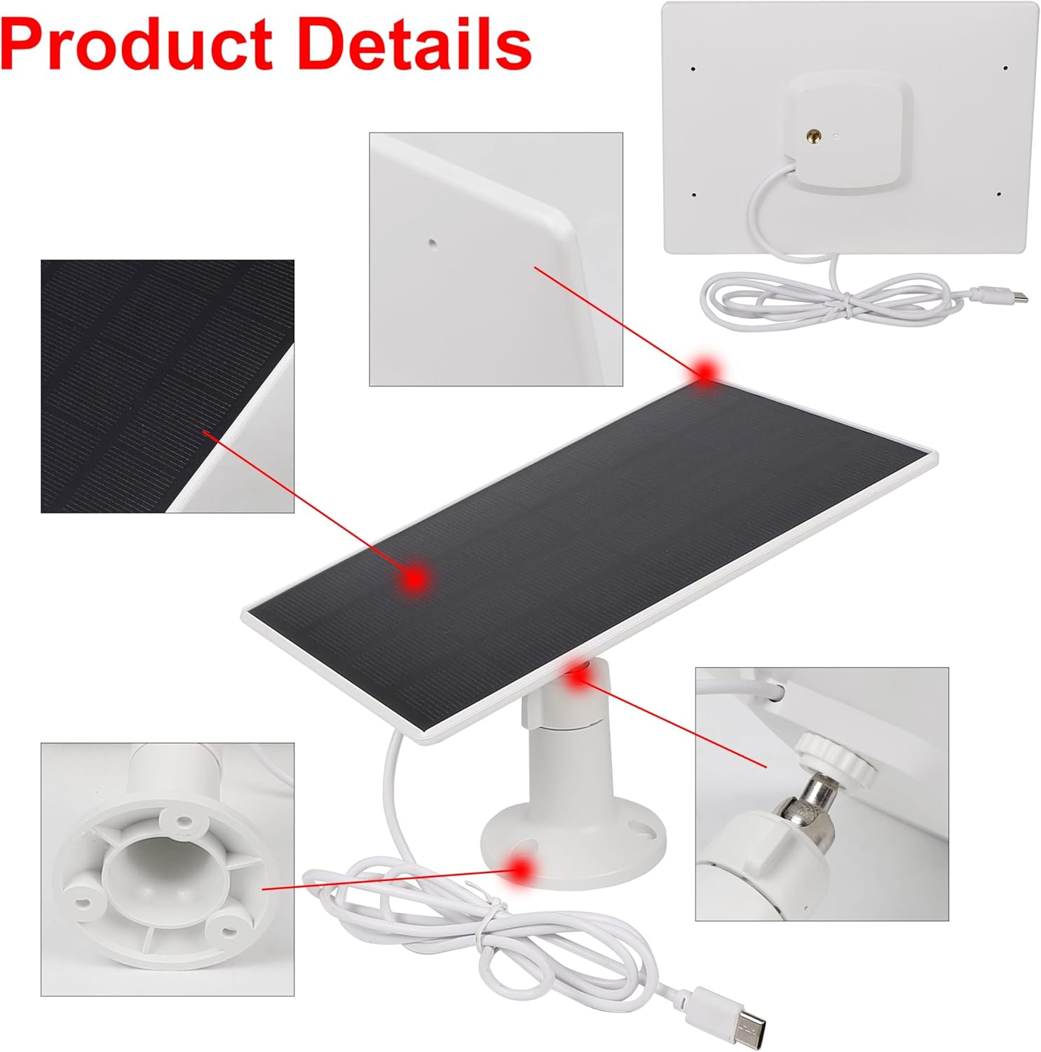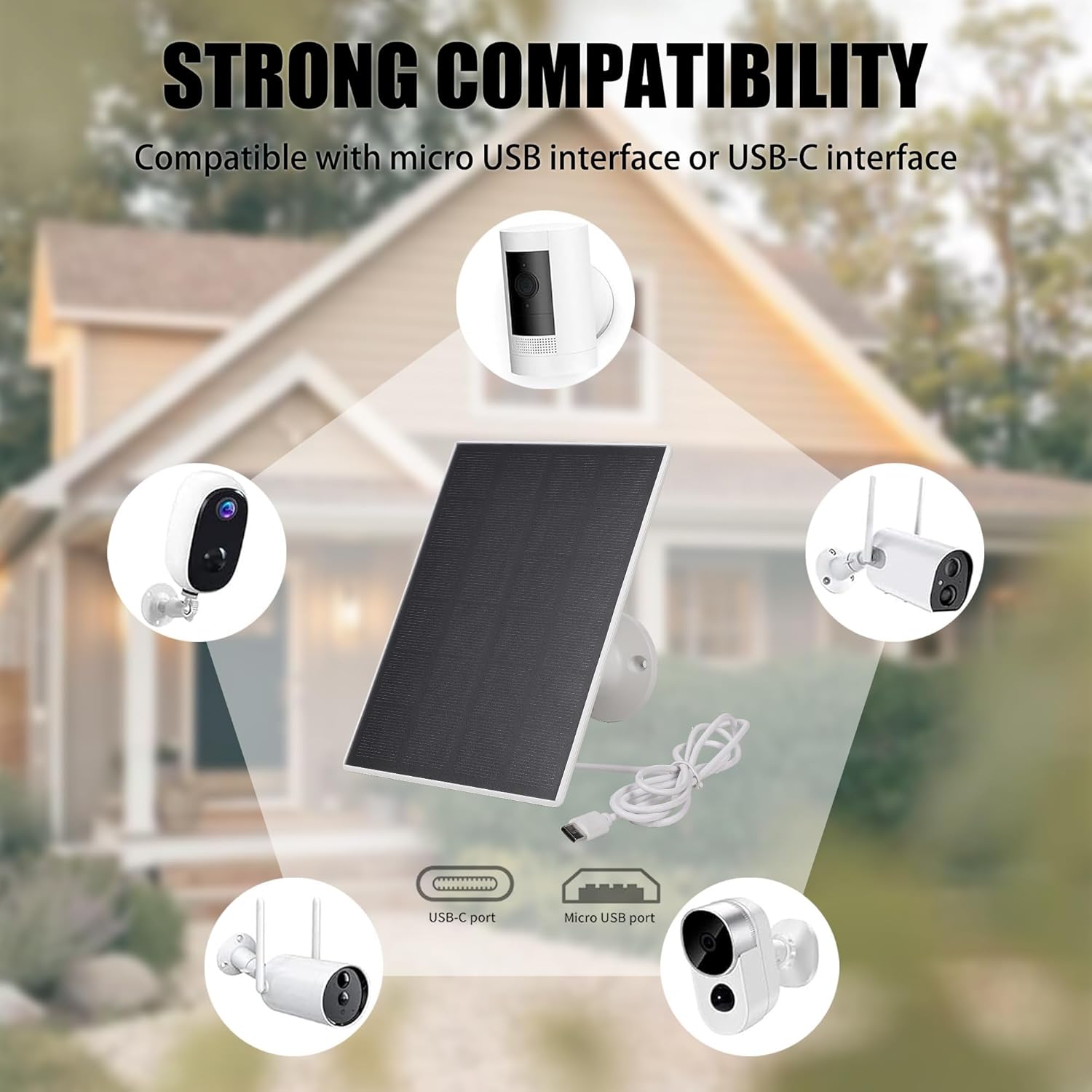 Harness the Sun’s Power-Keep Your Security Camera Charged !Introducing the high-efficiency 3W solar panel designed specifically for outdoor wireless cameras with built-in batteries. Engineered for convenience, durability, and maximum energy harvesting, this solar charger ensures your device never runs out of power—all while reducing your carbon footprint.3W High-Efficiency Solar ArrayUsing advanced monocrystalline technology, this panel efficiently captures sunlight and converts it into sustainable energy, providing continuous power to extend the operational time of your outdoor camera. Ideal for all-day sun-rich and even low-light environments.360° Adjustable Rotation BracketPosition the panel freely with a fully rotatable and tilt-adjustable bracket. Easily find the best angle toward the sun throughout the day—maximizing solar intake and optimizing charging performance season after season.Dual Charging Ports: Type-C + Micro USBCompatible with a wide range of devices thanks to dual output ports: USB Type-C and Micro USB. Simply connect the cable to your camera for seamless, automatic charging.IP65 Weatherproof & Anti-CorrosionBuilt to resist rain, UV exposure, and extreme temperatures. The sealed casing and PET materials make this solar panel a reliable all-weather solution for year-round outdoor use.Tool-Free Installation & Universal FitInstall easily on a wall, roof, fence, or post using the included adjustable mount. Pre-drilled holes and sturdy hardware allow for secure attachment in minutes. Works with most major brands of wireless security cameras. What’s in the Box?3W Solar Panel360° Adjustable MountMicro USB Output PortInstallation Kit with Screws User ManualPerfect For:Out wireless security cameras, ring cameras, trail cameras, and other USB-powered devices with 5V input.Go solar—never change batteries again!