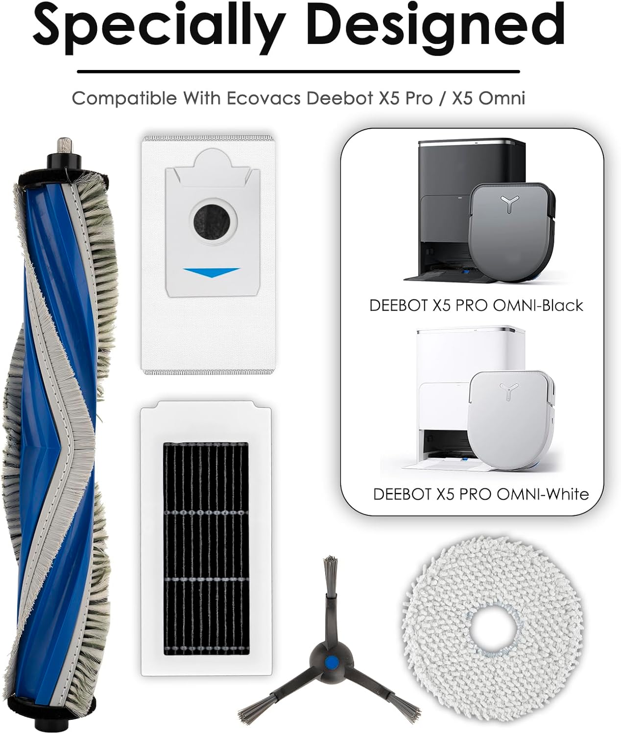 | Included Components | Accessories kit: 20 parts included: 1 Roller Brush, 4 Side Brushes, 7 Dust Bags, 4 HEPA Filters, 4 Mop Pads/ Perfectly compatible with ECOVACS DEEBOT X5 Omni/ X5 Pro Omni robotic vacuum cleaner/ Environmentally friendly |