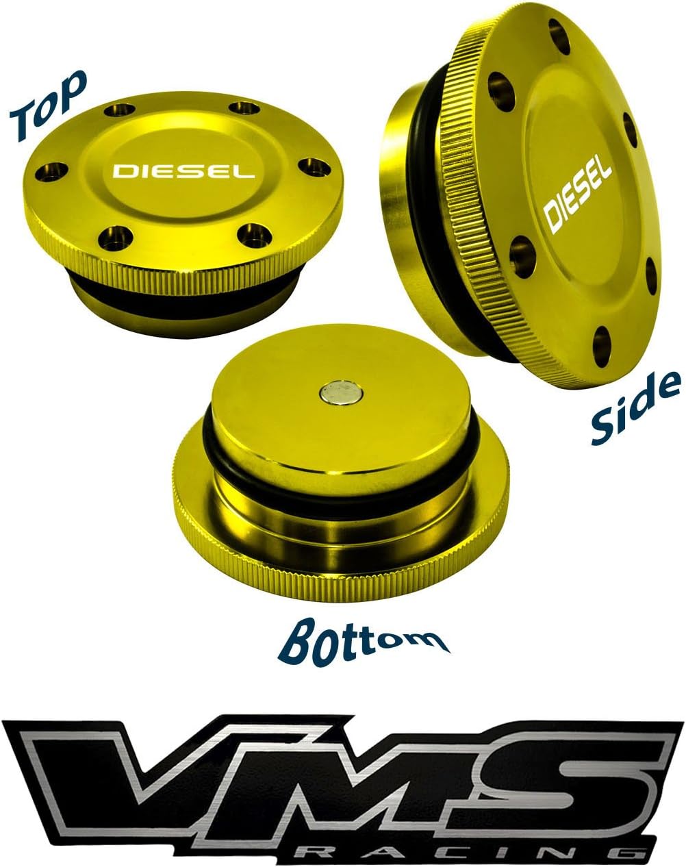 The VMS Racing Fuel Cap for Dodge Ram Diesel Trucks is made from CNC Machined lightweight 6061-T6 Billet Aviation-grade Aluminum. It features a Neodymium Rare-earth Magnet for secure hold onto your fuel door so that the cap is not accidently lost while fueling and a Bun-N Nitrile O-ring for superior resistance against wear from petroleum fuel. Diesel is laser-etched onto the fuel cap to prevent incorrect fuel usage. The VMS Racing Diesel Magnetic Fuel Cap replaces that ugly plastic OEM fuel cap that looks terrible right off the lot. This fuel cap will keep water, DEF fluid, dust, dirt and foreign matter from entering your fuel system causing unnecessary wear and clogging of internal parts. The magnetic feature keeps you from losing your oil cap while filling. Simply affix it to the interior of your fuel door while open. Even if you forget to put it on, when you close the door, the cap will swing into the fuel compartment.