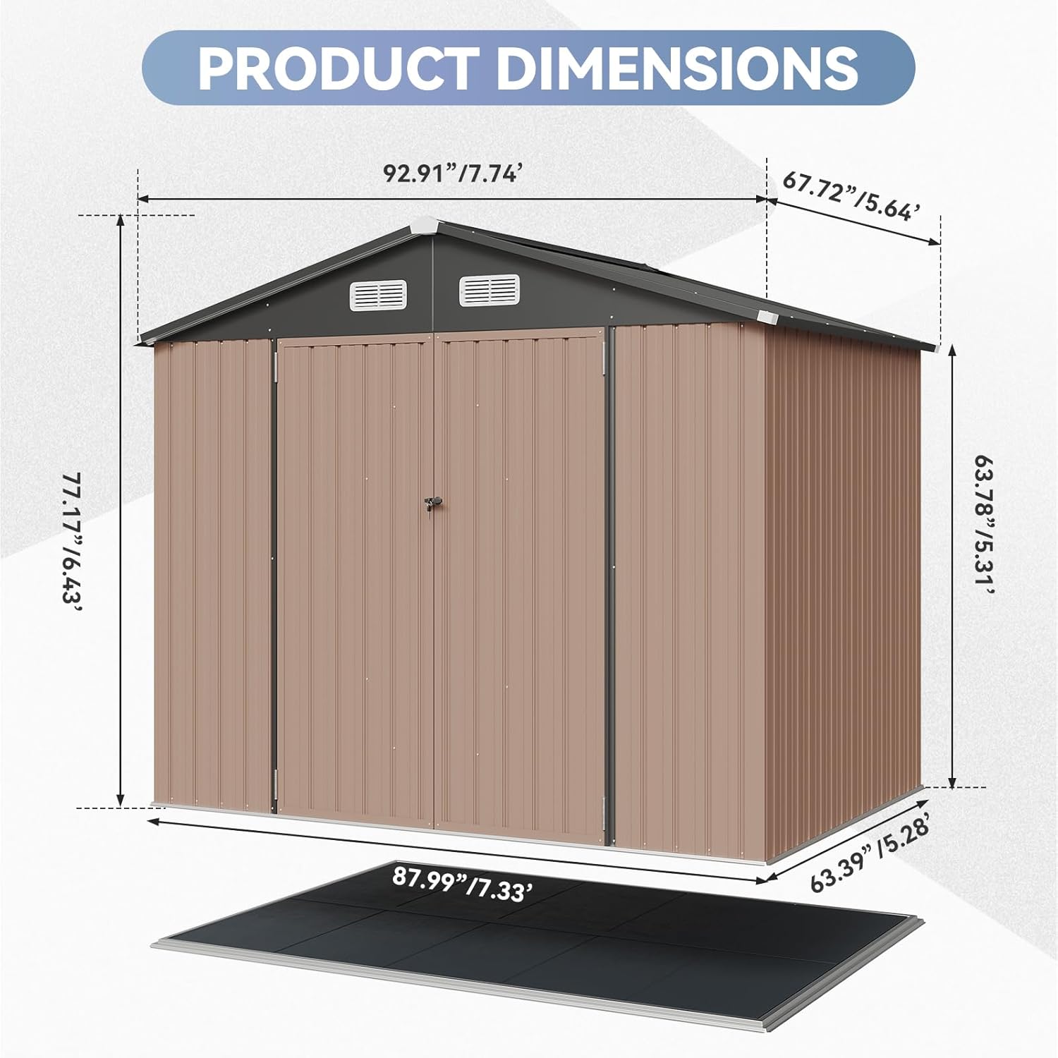 8x6 Galvanized Metal Shed with 15mm Moisture-Proof Floor – Heavy Duty Outdoor Storage Shed, Double Doors & Sloped Roof, Ventilation Design for Bike, Generator, Garden Tools (8x6 with Floor)