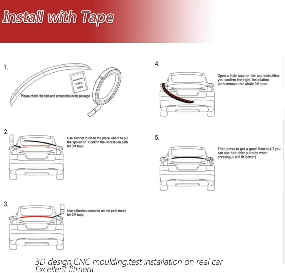 Carbon Fiber Spoiler for Audi A5 B8 B8.5 Base Coupe 2008-2016 Specification: Color: Gloss Black Material:Carbon Fiber Process: Vacuum molding Pattern:3X3 twill weaven Packaging:Carton box Installation:Free glue tape included, Excellent fitment Features: 1.Fitment: Fit for Audi A5 B8 B8.5 Base Coupe 2008-2016 2.3*3 Twill Weave Carbon Fiber material, with polished and shinning surface, ten times tough than steel 3.High Quality UV-Protected Clear Coating, Surface is smooth and shiny,enhance the appearance of the vehicle 4.3D design,CNC moulding,test installation on real cars, fitment 100% guaranteed 5.Impresses with its fitting accuracy and emphasizes the sporty lines of your car,stylish design gives a customized look 6.Add downforce, detach airflow, enhance stability, reduce fuel consumption 7.Embedded packaging,damp-proof,shockproof & crashproof, to avoid being damaged in long-distance transport Installation: glue adhesive tape included a. Clean & dry the surface on the position of car b. Compare & Check The Install Position c. Use glue tape & Silicon glue to help install. Silicon glue is not in package d. Press Gently e. Fixed And Held On