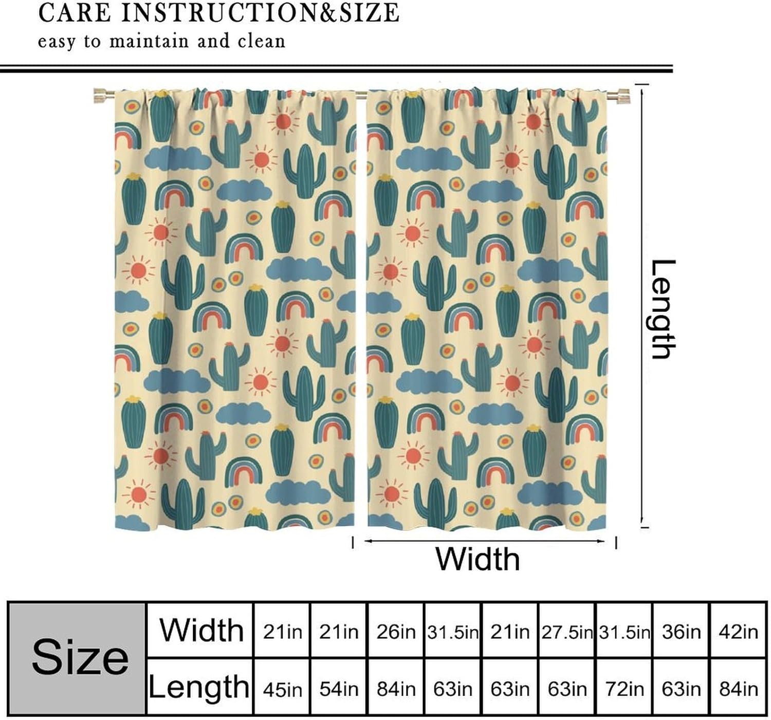 Curtains Package Includes:Blackout Window Curtains 2 panelsSize:1 panel measures 21 (W) x 45(L). The pair of 2 panels together measures 42" (W) x 45" (L) .1 panel measures 21 (W) x 54(L). The pair of 2 panels together measures 42" (W) x 54" (L) .1 panel measures 21 (W) x 63(L). The pair of 2 panels together measures 42" (W) x 63" (L) .1 panel measures 27.5 (W) x 63(L). The pair of 2 panels together measures 55" (W) x 63" (L) .1 panel measures 31.5 (W) x 63(L). The pair of 2 panels together measures 63" (W) x 63" (L) .1 panel measures 31.5 (W) x 72(L). The pair of 2 panels together measures 63" (W) x 72" (L) .1 panel measures 36 (W) x 63(L). The pair of 2 panels together measures 72" (W) x 63" (L) .1 panel measures 42 (W) x 84(L). The pair of 2 panels together measures 84" (W) x 84" (L) .1 panel measures 26 (W) x 84(L). The pair of 2 panels together measures 52" (W) x 84" (L) .Various sizes are available.About the material:Polyester fabricNo chemical coating, no peculiar smell, healthier and safer for people, especially babies and kids. About the function:1:It can block more than 85% of the sunlight and provide privacy protection 2:Perfect for bedroom, living room, kitchen, cafe, office, bathroom, dining room, dorm, nursery, outdoor patio etc. 3:It is also one of the best gifts for your family, friends, relatives or yourself.Warm Notice:1:The pattern is only 1 side and the other is white.2:Due to manual measurement, please kindly allow a 1-2 cm discrepancy.