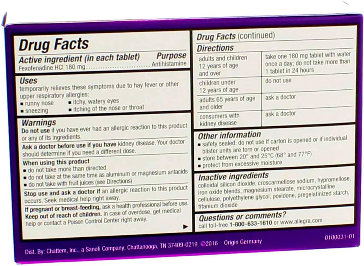 Allegra, Allergy, 24 Hour, Indoor And Outdoor, 180 Mg, Tablets 15 Count. Get fast-acting relief from tough allergy symptoms like a runny nose, sneezing, itchy, watery eyes and itchy nose or throat. Active ingredient (in each tablet) 24 Hour Tablet: Fexofenadine HCl 180 mg. NDC Code(s): 41167-4120-2