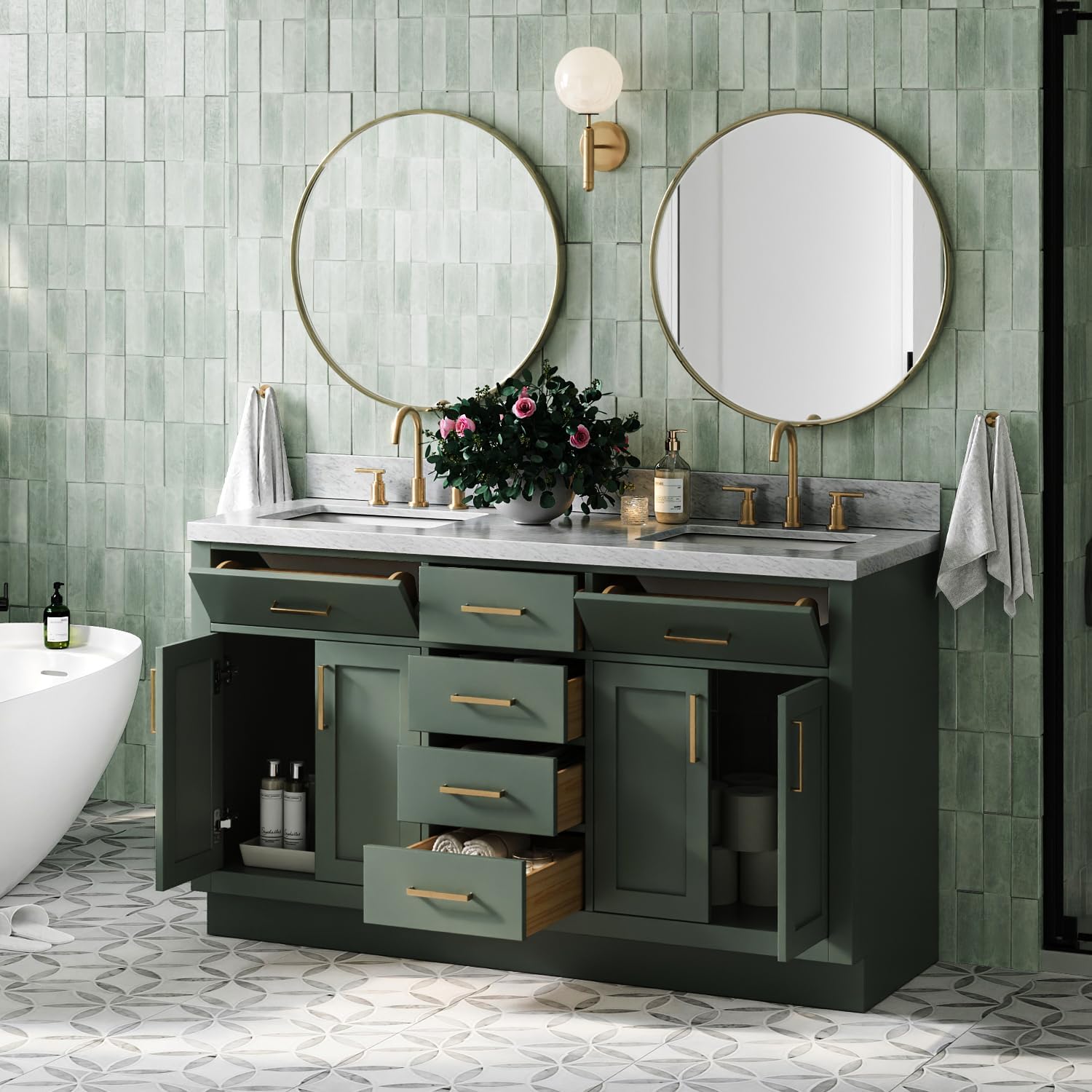 Hepburn collection from ARIEL Bath is the perfect combination of elegance and form, taking inspiration from traditional cabinetry with a modern twist. Constructed from high quality hardwood plywood with a tilt-down top drawer to keep smaller items conveniently at hand. This bathroom vanity with sink will be sure to last for many years to come. Cabinets are available in White, Midnight Blue, Black, Vintage Green, Grey, Natural Oak, Black Oak, Brown Oak finishes, you can be sure to find the right color fit for your bathroom decor.