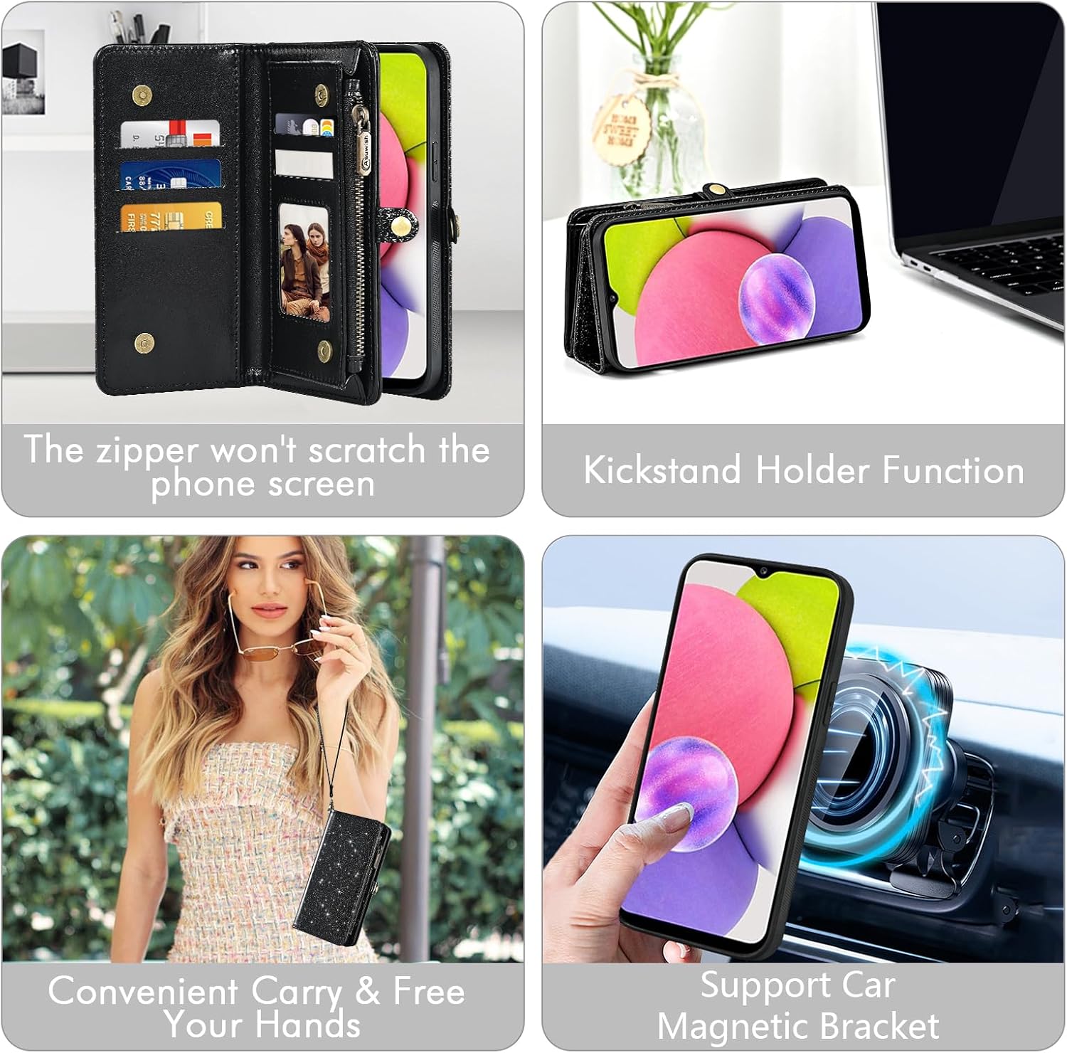 【Compatible Models】: Compatible with Samsung Galaxy A03s (US version), NOT compatible with other version or other devices.【Package includes】: We will send the phone case with 1 piece tempered glass screen protector + 1 detachable wrist strap + 1 detachable crossbody strap.【Support Detachable & Magnetic Car Mount】: You could use the removable back cover as a simple protective back cover alone, the back cover with built-in metal disk can be attached to a magnetic car phone holder, but please notice that it don't work with wireless charging.
