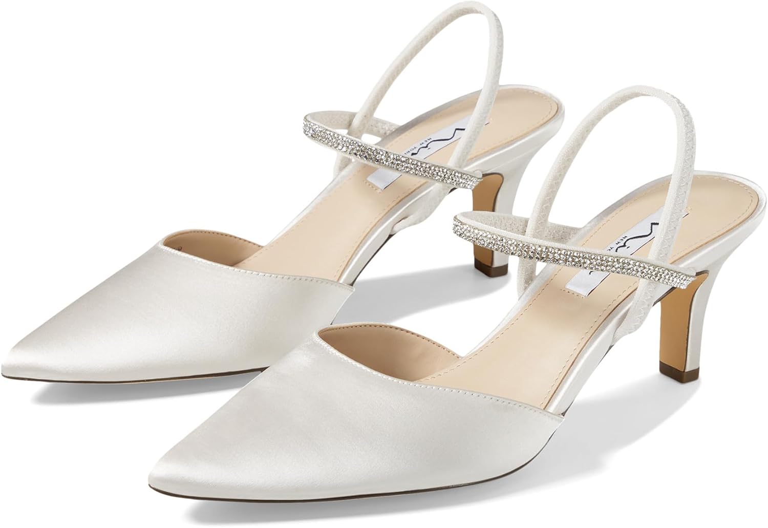 Simply stunning and so easy to wear, BIllie by Nina, is adorned with a crystal covered elastic instep strap for easy entry, as well as an elastic heel strap for a secure fit. Set on a universal mid-height heel, this pump compliments any event outfit from a pantsuit to a gown. Offered in an array of glamorous materializations. Mid-heel measures 2.5" 64mm Pointed-toe shape Elastic vamp and sling strap Crystal-covered instep strap Lightly cushioned insole Man-made upper material and lining Composition leather sole Imported