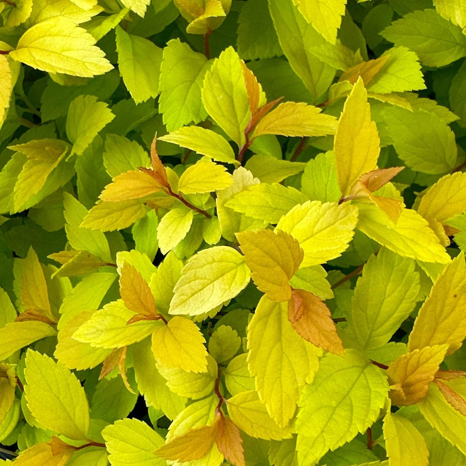 'Gold Mound' spirea is a cultivar deciduous shrub in the Roseaceae (rose) family with vibrant golden colored foliage. It is a hybrid cross between S. japonica 'Alpina' and S. japonica 'GoldFlame'. This beautiful compact shrub will produce tiny flat-topped clusters of pink flowers and ovate leaves that will change colors with the season. Flower blooms from spring to summer. The brilliant foliage will turn yellow-greenish in the heat of the summer and then yellow-orange red in the fall when the weather cools. Beautiful chartreuse foliage for multi-season interest. Compact form and mound-like habit, it can grow up to 2-3 feet tall and 4 feet wide when matured. Moderate growth rate. Great for containers, specimen planting, small groups, borders, along a foundation, or low hedge. Grows in zones 4-8 and prefers full sun to partial sun and moist, well-drained soil. Planting in a sunny spot will ensure the best foliage color.