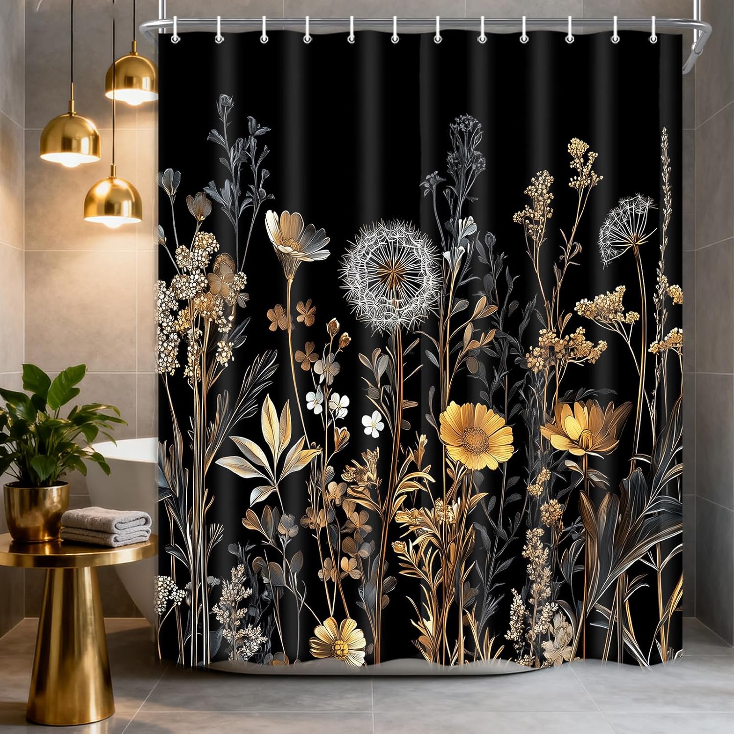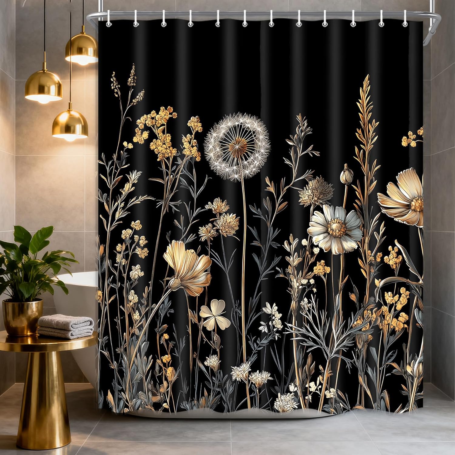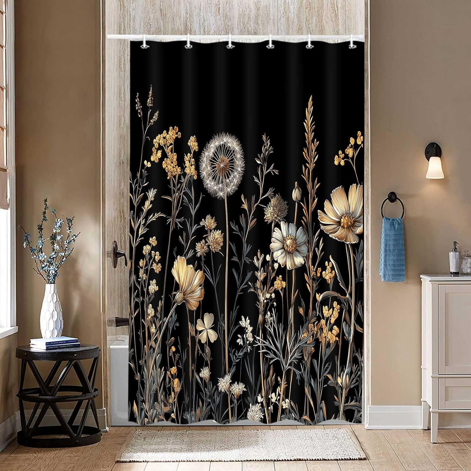 Why choose this shower curtain? Transform your bathroom into a serene, luxury retreat with our Black Gold Wildflower Shower Curtain—where botanical elegance meets modern design. Set against a deep black backdrop, golden-hued dandelions, daisies, and delicate wildflowers create a striking contrast that elevates any space. Whether your style is minimalist, bohemian, or contemporary, this curtain adds a touch of light luxury to your daily routine. This High Quality Bathroom Shower Curtain Is Made Of Polyester Fabric, Which Is Soft To The Touch. Shower Curtain Material : Polyester Waterproof Fabric Shower Curtain Size: 36WX72H/47"X64H/ 60WX72H /72WX72H/ 72WX75H/72WX84" /72WX96H , Accept Customized Any Size. Package Include: 1 Shower Curtain+ Hooks Notice: All Dimensions Are Measured Manually With Deviation (Ranged) At 1-3mm. Item May Be A Little Different From The Picture Due To The Lighting And Your Monitor’S Display.