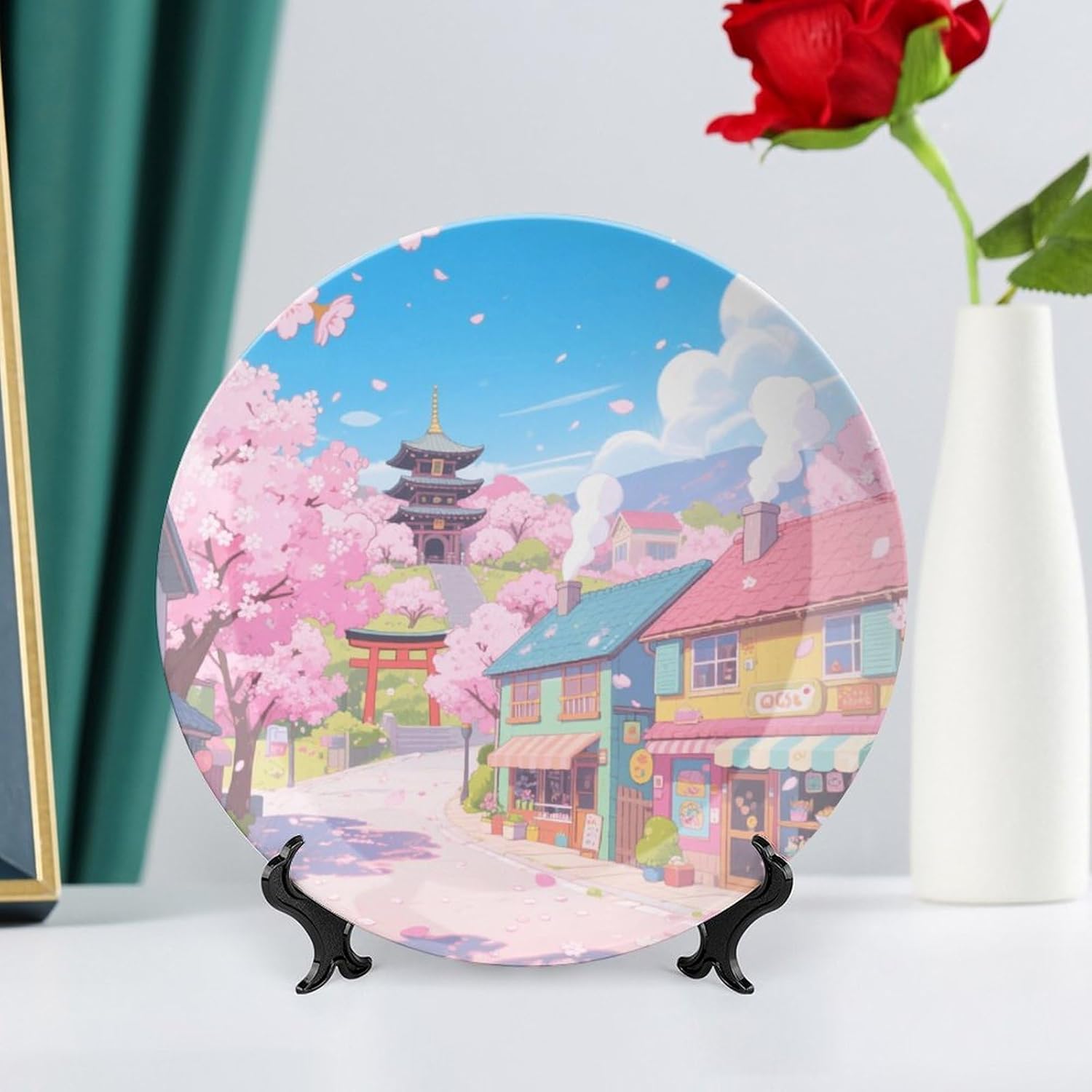 Bone China Decorative Plates Sakura Town Ceramic Decorative Plate Wall Decor with Display Stand Ceramic Ornaments for Wall Hanging Decoration