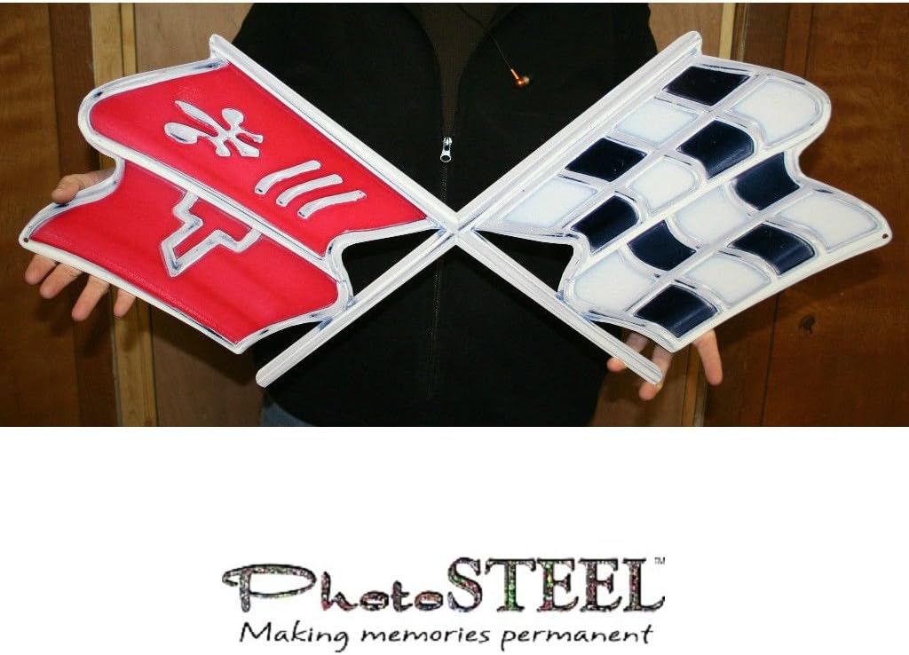 When we came across this item, the only thing we could think was WOW!This is a photo of the C3 68 emblem taken with a high end digital camera and with PhotoSTEEL technology it is transformed onto 14 gauge flat steel. The result is a high quality emblem that is a full 32" by 13" in size. This is not a cheap vinyl overlay that will weather quickly outside but a nearly indestructible Corvette piece of art that will wear just as good outside as inside.GM was just as impressed as we were and granted it an official GM licensed product.Please note: the emblem from 73-76 was embedded in a starburst and the checker flag started with a white square on top. Even though this wall emblem is not a exact match to the 73-76 it is close match minus the outer starburst and the checker flag starts with the a black square on top.