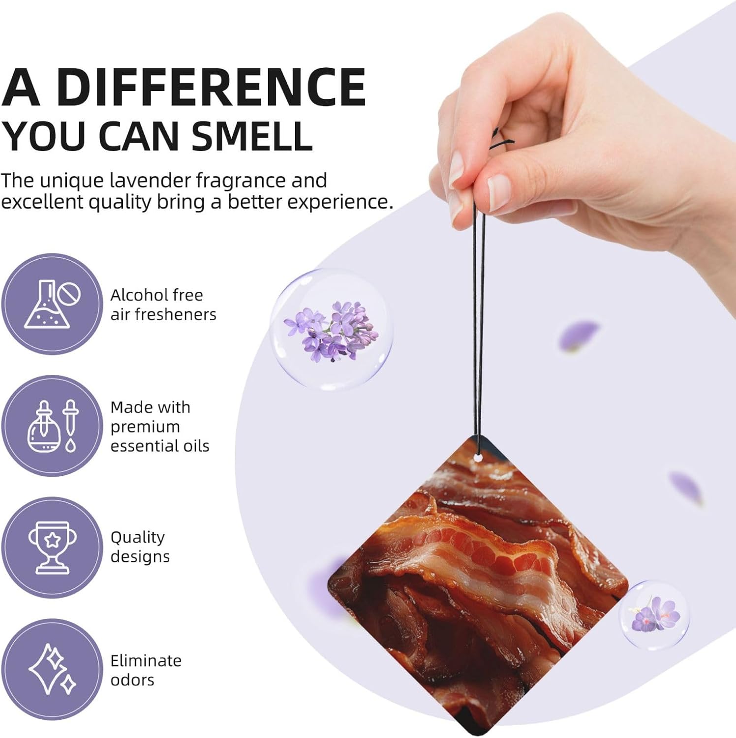 unobstructed vision: this Bacon Pattern rearview mirror scented fresheners doesn't obstruct your vision while driving, ensuring a safe and comfortable journey every time.easy hang: we've included a convenient rope for hanging, making it super easy to attach this christmas air freshener wherever you prefer. No fuss, no mess - just hang and enjoy the fragrance.incredible package deal: this rearview mirror pendant aromatherapy tablets package includes 6 pieces in 6 captivating designs and 1 refreshing scents (lavender). Experience a variety of delightful fragrances that will keep your surroundings smelling wonderful throughout the day.environmental protection: the car air fresheners for women smell can last for about 1-2 weeks. When the smell fades, you can add your favorite perfume. Continue to use, reusable6 pcs included: you will receive 5 individual shoe cabinet fresheners, each in its own package; enjoy consistent scents for nearly a year, or share them with your friends or families