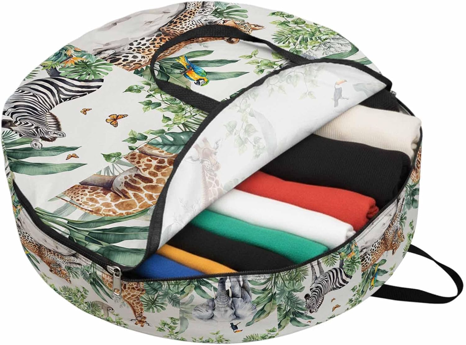 Reclaim Your Closet Space with the Round Storage Solution! Material: polyester Diameters: 24 inch, 30 inch, 36 inch Depth: 7 inches Package Includes: Round Storage Bag One Bag, Endless Possibilities: Whether you are swapping out your summer wardrobe, moving into a new dorm, or packing away holiday decorations, this bag has you covered. The circular design is uniquely suited for: Bedding: Comforters, quilts, sheet sets, and oversized pillows. Clothing: Winter coats, sweaters, and bulky ski gear. Home Decor: Holiday wreaths, garlands, and floral arrangements. Outdoor Gear: Camping blankets, sleeping bags, and beach towels. Dual Zippers: The high quality double zipper design allows the closet organizer to open wide from both sides, making it effortless to load and unload even the bulkiest comforters or wreaths. Reinforced Handles: Sturdy, reinforced handles are securely stitched to provide extra strength and a comfortable grip when carrying heavy loads or pulling the bag from under a bed. Clear Label Pocket: A transparent built-in label holder allows you to quickly identify the contents of each bag without ever having to unzip it, keeping your storage perfectly organized.