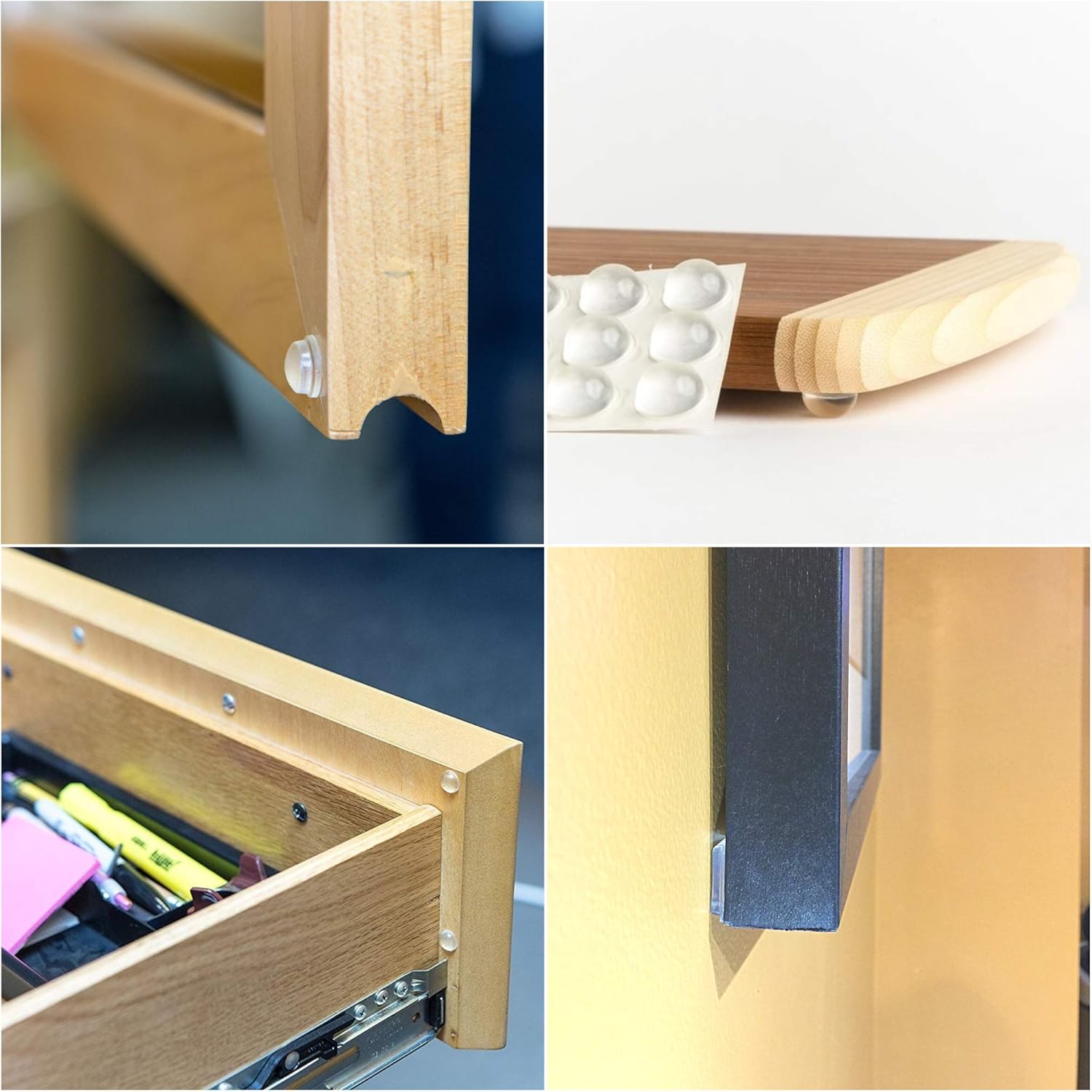 Premium Quality Clear Bumper Pads Combo Pack! Protect your cabinets, glass table tops, furniture, decor, walls and floors with these premium surface cushion guards! Soft, clear self-adhesive protectors will quickly and easily attach to any surface for non-slip, scratch-proof furniture protection from abrasion, vibration, shock and noise.106-Piece Combo Pack Contains:* 20 PCs Circle - 9.5mm (0.375") width x 3.2mm (0.125") thick * 20 PCs Circle - 12.7mm (0.50") width x 3.5mm(0.14") thick * 24 PCs Spherical - 10mm (0.39") width x 3mm (0.118") thick * 22 PCs Spherical - 11.1mm (0.44") width x 5mm (0.20") thick * 20 PCs Square - 12.7mm (0.50") width x 3mm(0.12") thick Clear bumpers will remain virtually unseen and are non-staining Made of Polyurethane Made in USA Applications include Cabinets, Drawers, Glass Products, Cutting Boards, Sliding Doors, Furniture, Windows, Wall Hangings, Plastics, Small Appliances, Audio & Video Equipment, Computers, Laptops, Wall Protection, Corner Protection and many other uses at your Home and Office. Application Instructions:- Make sure the target application surface is clean, dry and free of debris.- Clean the surface with a mild solvent such as alcohol if needed- Grasp bumper on the sides without touching the adhesive- Press bumper firmly into place on application surface- Note: Bumpers cannot be repositioned without ruining adhesive.