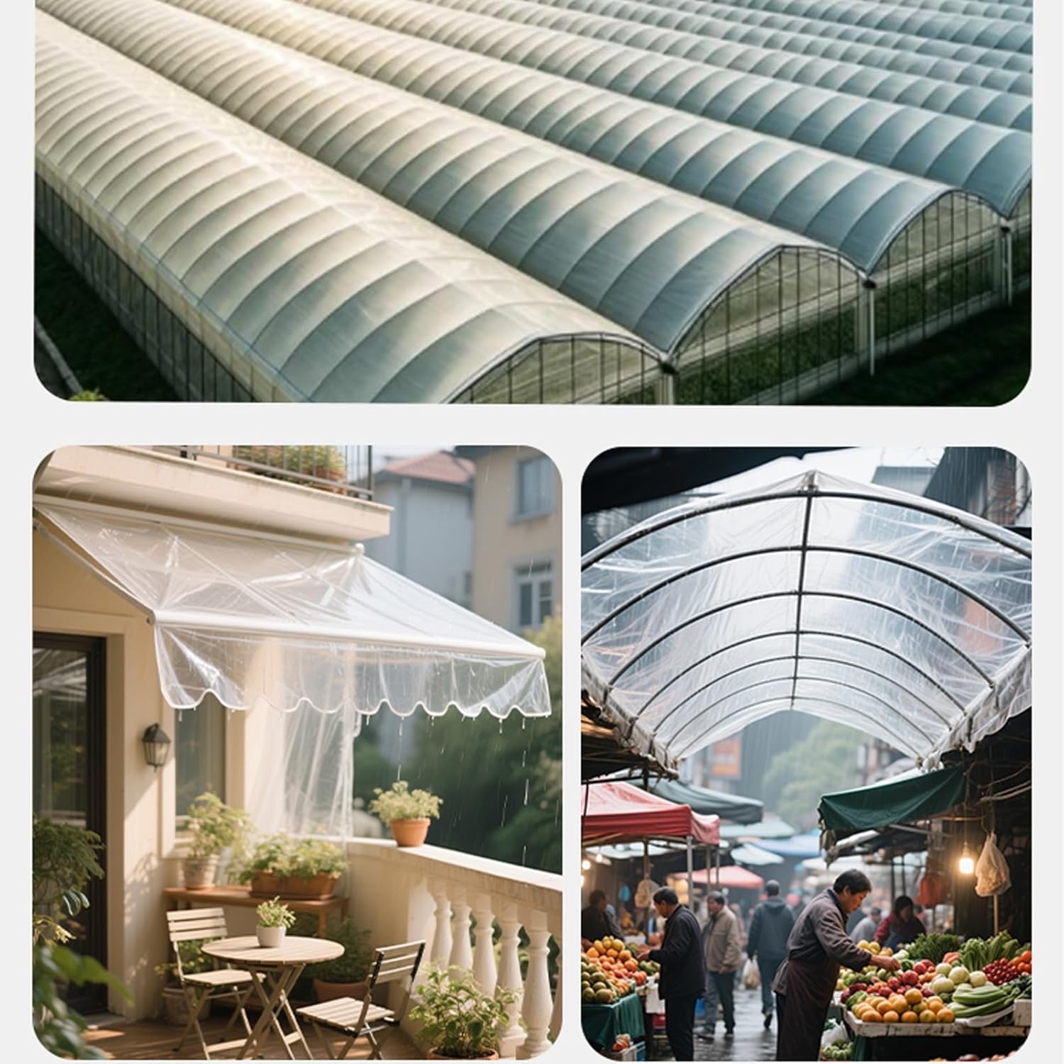 ▶ Made from transparent material that allows ample light transmission, providing rain protection without blocking natural light.▶ Dense material effectively blocks rain penetration, protecting items underneath from moisture.▶ Made with thickened material for tear resistance and durability, extending its lifespan.All four edges feature perforations to prevent damage.Holes punched every 1 meter during edging enhance securing effectiveness.Soft texture allows for folding storage, saving space and facilitating portability and organization.Suitable for balcony rain protection, plant insulation, greenhouse covering, temporary outdoor shelters, and more.