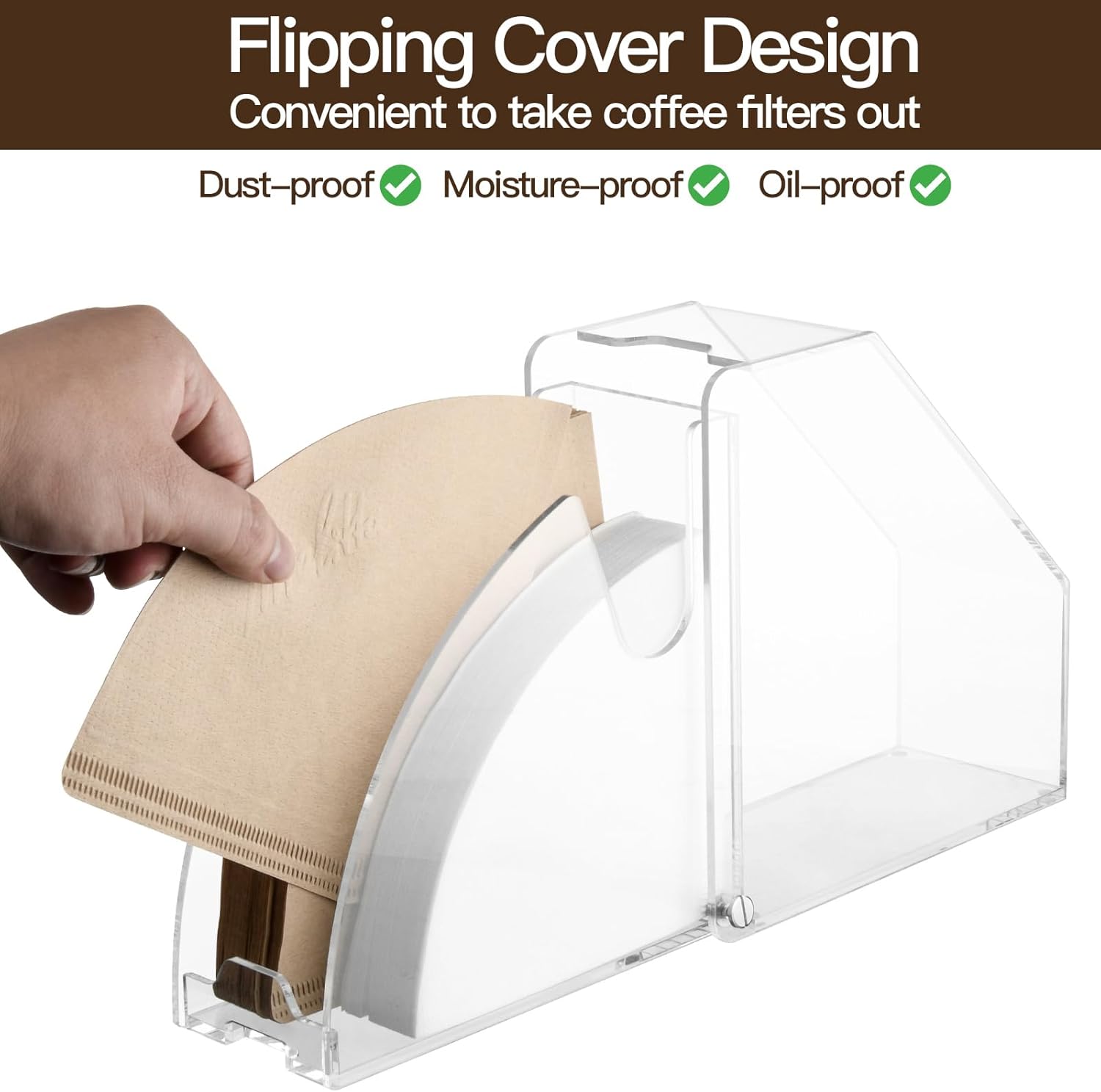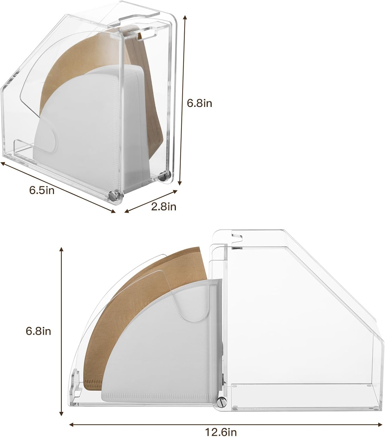 Cone Coffee Filter Holder Storage - Pour Over Coffee Paper Filter Holders Container Dispenser for Counter for Organize #4#3#2#1 Cone & V60 Coffee Filters 🧰【Dustproof and Detachable】--- The coffee filter storage with acrylic cover design can keep the paper filters clean, dust-proof, windproof and moisture-proof, help you easy to view and replenish quantities. Coffee filter stand and acrylic plate can be easily disassemble for easy cleaning. ✅【Convenient to Use】--- Standing design, the flexible rotation axis can be opened or closed to a perfect 90°, easy to put and take out coffee filters. Exquisite appearance can decorate your coffee counter and coffee bar. 🔍️【Large Capacity Storage】--- Dimension: 6.5"L x 2.8"W x 6.8"H. The coffee filter paper holder can hold about 100pcs cone-shape and fan-shape paper filers, suitable for 01# 02# 03# 04# cone and V60 filter papers. 💎【Multifunction】- This coffee filter holder canister is not merely suitable for coffee filter papers, but also can accommodate notes and storing napkins as well. 🔹【Unique Geometric Shape】- This coffee filter holder has been made of high quality clear acrylic material, simple yet classic. The transparent design shows your items elegantly and clearly. Comes with a lid, convenient, dust-proof and keeps the paper filters clean 👍【Perfect & Modern Design】- No need to install. Directly put on the counter. A perfect holder to store and organize your coffee filters, no more filter boxes taking up space! It keeps your space organized and adds to stylish lifestyle 🎁【Great Gift Idea】- This geometric coffee filter holder is an ideal gift for coffee lovers on birthday, wedding, anniversary, valentine's day, women's day, mother's day, thanksgiving, Christmas, housewarming, etc.