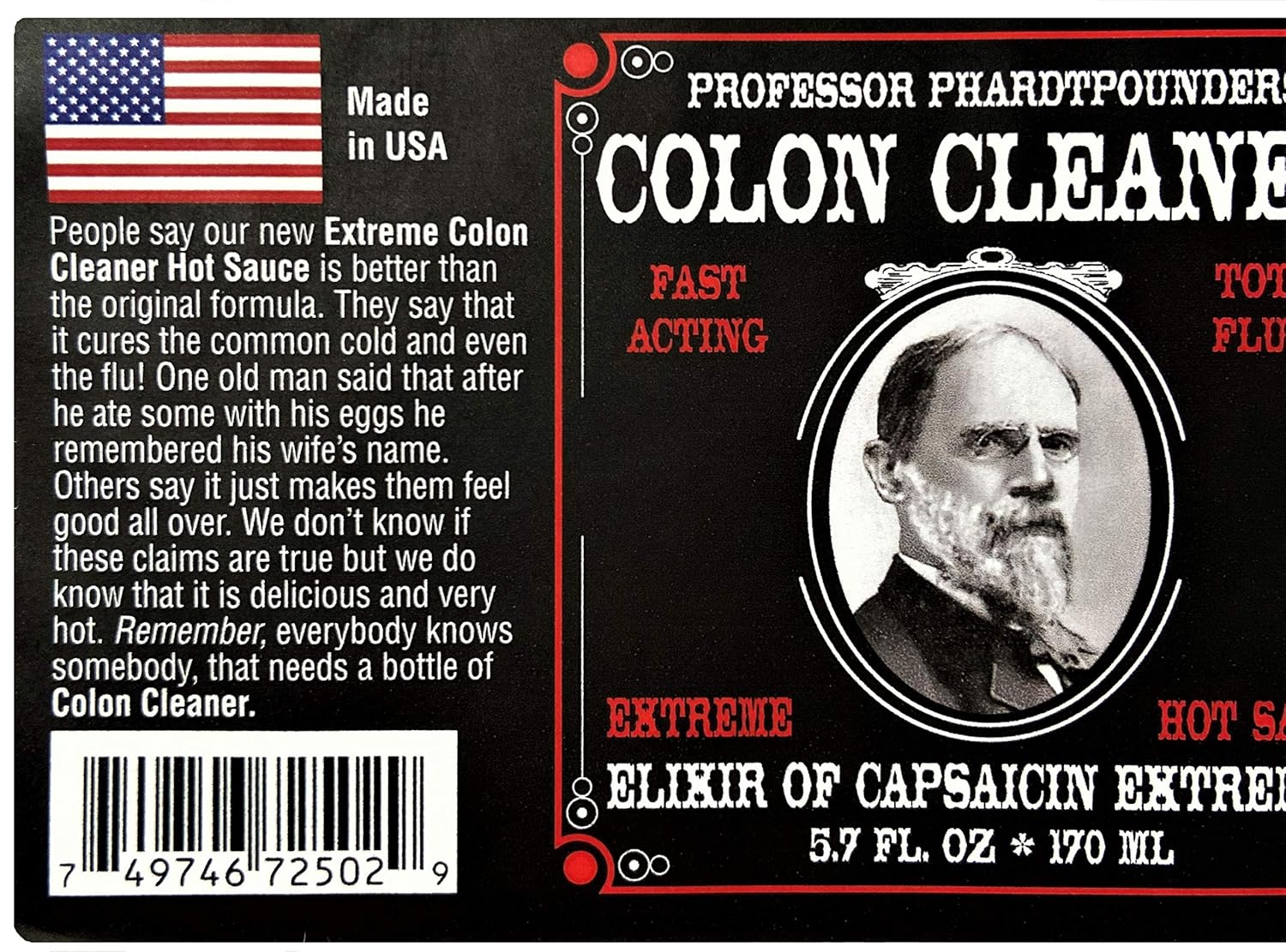 Professor Phardtpounders Colon Cleaner Extreme Hot Sauce - Elixir of Capsaicin Extremus is an excellent creation of a Caribbean Mustard Hot Sauce. It delivers a lot of heat and an unforgettable island flavor to your meals, to say nothing of the laughs and chuckles it will bring when you put a bottle on your table. You must keep a bottle in your collection at all times. Everyone knows someone who needs a bottle of Colon Cleaner Extreme.