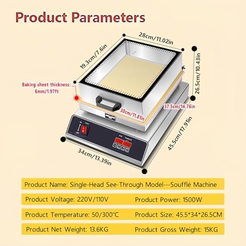 Discover the versatility of our Commercial Electric Soufflé Maker, designed to elevate your culinary creations. Perfect for preparing an array of delicious meals, this appliance is ideal for pancakes, crispy bacon, grilled cheese, full breakfasts, steaks, burgers, waffles, and, of course, soufflés. Equipped with a user-friendly digital control panel, this soufflé maker allows you to customize your cooking experience with adjustable temperature and time settings. With a temperature control range from 50 to 300 degrees Celsius, you can easily adapt your cooking to suit various recipes and personal preferences, ensuring optimal results every time. The heating plate, made from 6mm thick pure copper, offers exceptional thermal conductivity for quick and efficient heating. Its smooth surface is safe to handle, providing a hassle-free cooking experience. The powerful heating tube guarantees rapid warming and consistent cooking, making it an excellent choice for commercial kitchens and home chefs alike. The sturdy construction of the machine features thickened stainless steel, ensuring stability and reliability. It is also designed for easy cleaning, resisting oil stains and rust, so you can maintain a pristine cooking environment. **Product Specifications**: - **Single Head Electric Soufflé Machine**: 1500W, AC 110/220V, 6mm copper grill plate, stainless steel body, dimensions 45.5 x 34 x 26.5 cm, grill plate size 30 x 37.5 cm, weight 15 kg, temperature range 50℃ to 300℃. - **Double Head Electric Soufflé Machine**: 3000W, AC 110/220V, 6mm copper grill plate, stainless steel body, dimensions 45.5 x 64 x 26.5 cm, grill plate size 60 x 37 cm, weight 24 kg, temperature range 50℃ to 300℃. **Included in the Package**: - 1 Soufflé machine - 1 User manual Should you have any questions after receiving your product, please feel free to reach out to us. We are committed to providing you with a satisfactory resolution. Experience the art of cooking with our Com...