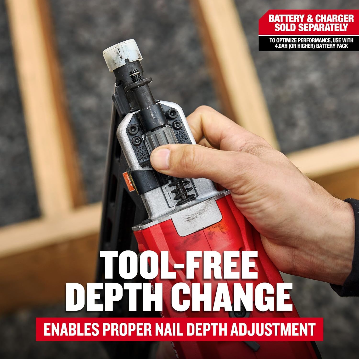 Eliminate the need for compressors, hoses, and gas cartridges with the V20* BRUSHLESS RP 30° Framing Nailer (tool only/battery and charger sold separately). The brushless motor allows this powerful tool to sink up to 3-1/4 in. full round-head nails into various materials, including laminated veneer lumber. The tool-free depth change setting enables quick nail adjustment for proper nail depth.