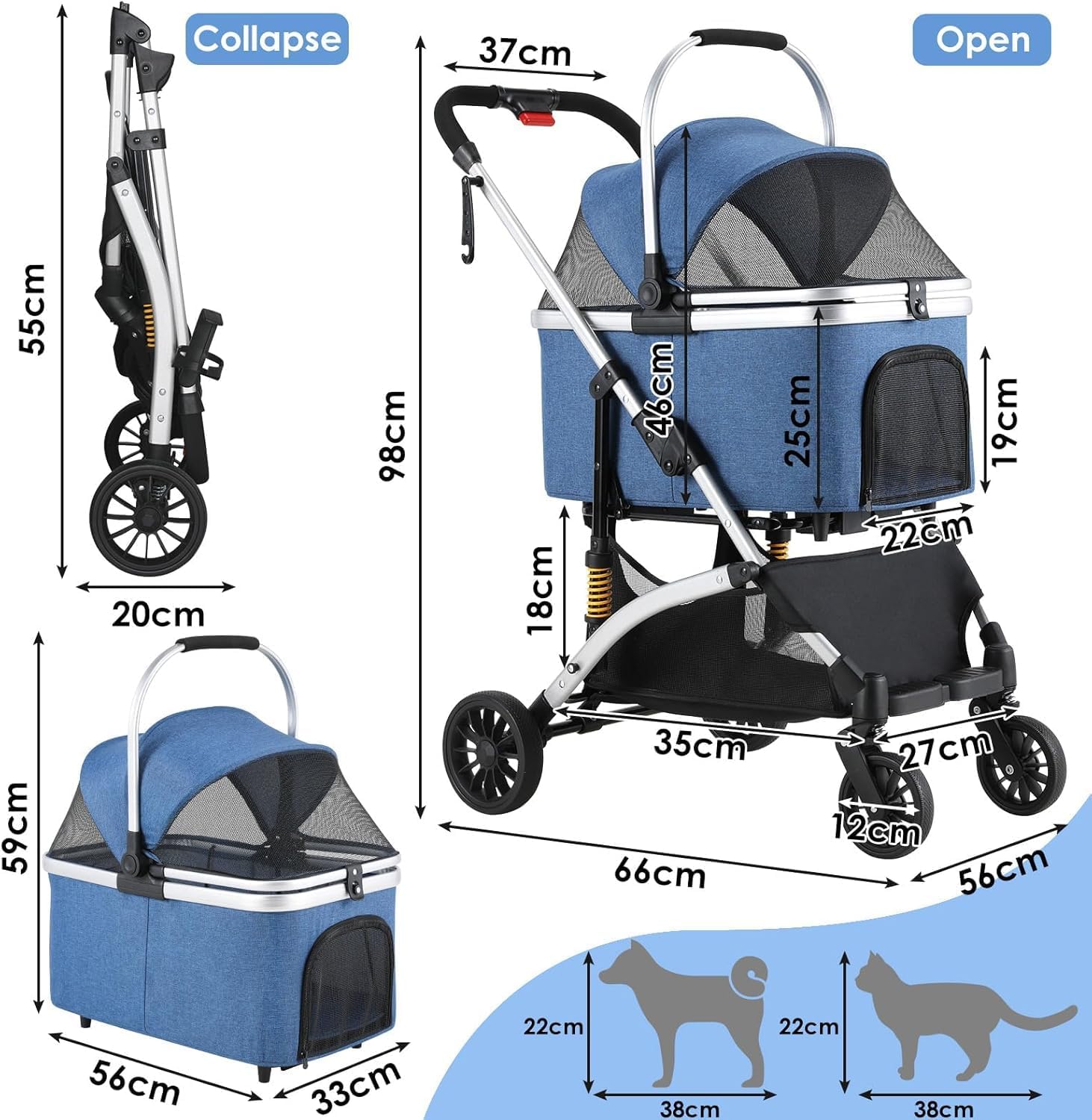 Suitable for dogs and cats: Teddy, Shiba Inu, all breeds of cats, etc. Body material: carbon steel Cloth material: waterproof linen Body unfolded size: 66*56*98 (CM) Carrying basket unfolded size: 33*56*59 (CM) Carrying basket size: 59*20 (CM) Wheel size: front 12/rear 16.5 (CM) Gross weight/net weight: 6.8/5.8 (KG)