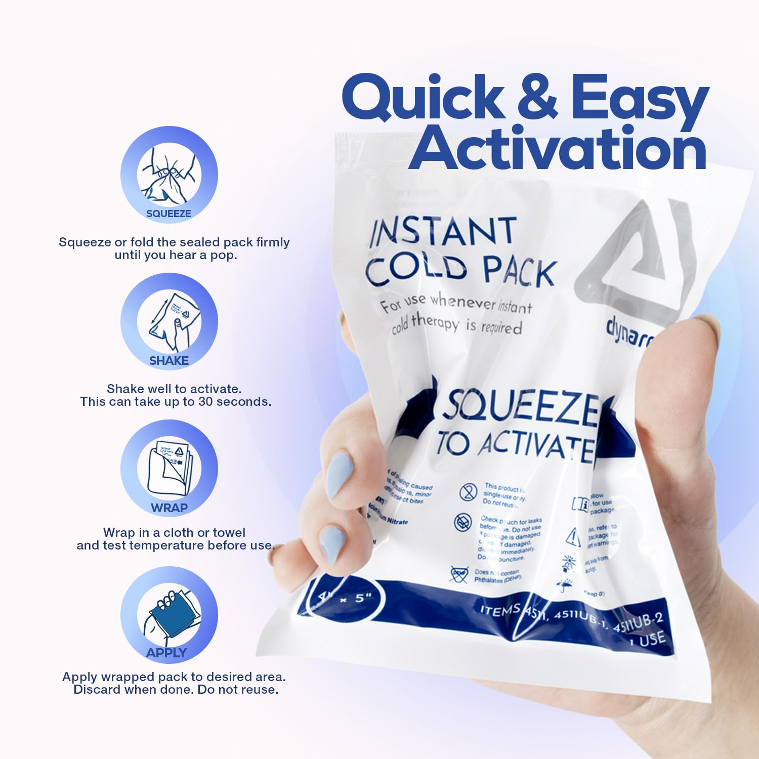 Compact & Child-Friendly Size With this value bundle, you are not just investing in a first aid kit; you are investing in your peace of mind. Each cold pack comes in a size of 4x5-inch which makes it ideal for soothing pain in smaller parts of the body like the knees, elbows, and jaws. The size is also child-friendly and makes it easy for small hands to hold, reshape and keep in place. These compact-sized packs are also ideal for traveling. Long-Lasting Cooling Effect Cold therapy is a critical first aid response for a variety of emergencies like twisted ankles, minor burns, and bites. It also offers fast relief from joint pain and lower back discomfort, headaches, and more. Our ice packs are made to give you a cooling effect for a considerable amount of time. You don't have to refill it with ice or put it in the chiller — the cold may last up to 15 minutes.