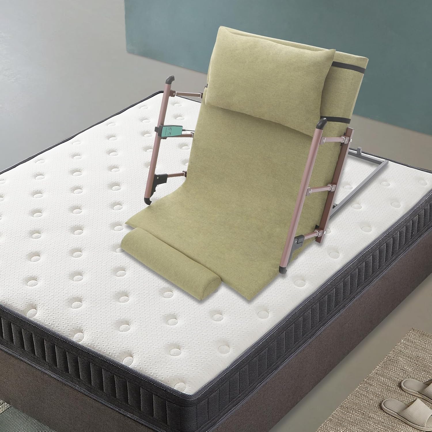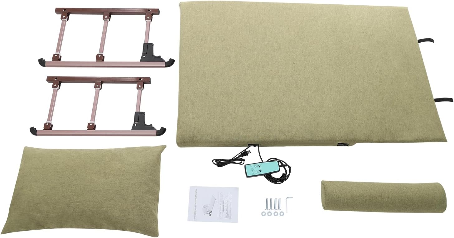 DescriptionThis electric lifting bed backrest is an intelligent care product designed specifically for the elderly, people with limited mobility, and those who require long-term bed care. It provides users with a comfortable, safe, and easy to operate sleeping and resting environment by advanced motor technology and ergonomic design. This product not only helps users easily achieve posture changes from lying flat to sitting upright, but also provides a variety of thoughtful designs to ensure that users' daily lives are more convenient and autonomous.DetailsMagic Tape: This design can fix the pillow on the mattress to prevent displacement.Guardrail Button: It is convenient for users to fold the guardrail, making the operation simpler.ApplicationThis product is suitable for pregnancy, the elderly, the disabled, the injured or those recovering from surgery. It is designed to fit on an ordinary single, double, and sofa beds, even tatami mats.SpecificationMaterial: Carbon Steel, Cotton and Linen, Sponge, Aluminum AlloyColor: GreenProcess: Electrostatic SprayingStyle: ModernAssembly Required: YesMounting Type: Bed MountControl Mode: Remote ControlPlug Type: US StandardMotor Type: DC MotorVoltage: 90-240VPower: 50WCurrent: Input 1.2A; Output 2ALifting Angle: 2-80°Power Cable Length: 2.5m/8.2ftRemote Control Cable Length: 2.5m/8.2ftProduct Size: 120*75cm/47.24*29.53inGuardrail Length: 43cm/16.93inLeg Pad Size: 49*12*5cm/19.29*4.72*2inPackage Size: 83*77*15.5cm/32.68*30.31*6.1inMax. Load Capacity: 300kg/661.39lbsGross Weight: 13.3kg/29.32lbsNet Weight: 12.64kg/27.87lbsPackage Included1* Electric Lifting Bed Backrest1 Pair* Guardrail1* Pillow1* Short Mat1* Leg Pad1* English Manual1* Chinese Manual