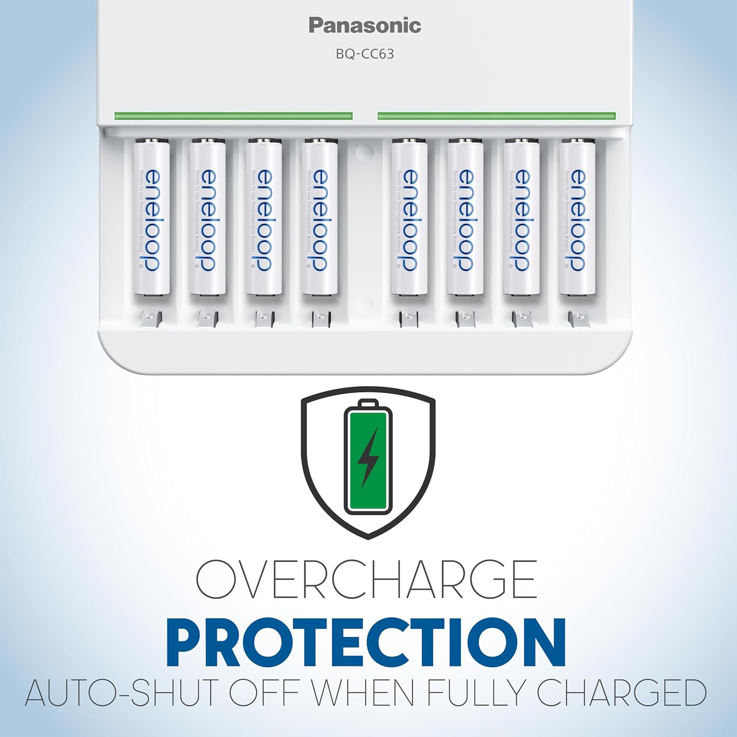 eneloop AA and AAA NiMH ready to use rechargeable batteries utilize Panasonic advanced rechargeable battery technology, allowing them to be recharged up to 2100 times. eneloop AA and AAA rechargeable batteries deliver consistent power performance, maintain 70% of their charge for up to 10 years, come pre-charged by solar power (at the factory) and are ready to use out of the package. These eneloop batteries also feature extreme temperature performance down to -4 degrees Fahrenheit. Pair eneloop and eneloop pro AA and AAA batteries with Panasonic advanced, quick advanced, or super quick advance eneloop chargers to maximize your rechargeable battery experience. The Panasonic eneloop pro BQ-CC63, 8-position Ni-MH battery charger can quickly, and individually charge any combination of up to eight AA or AAA eneloop batteries in just 5 hours or 3 hours for eight AAA batteries. Individual charging means you can easily and efficiently charge from 1 to 8 batteries with differing levels of remaining charge. A huge time saver! The CC63 charger also features 8 individual LED charge indicator lights. Once batteries are installed, the charger measures each cell, and the corresponding light rapidly flashes and then becomes a solid green color while charging the battery cell. Once the battery is completely charged, the LED light turns off for that cell. Ideal for use at home or in the in the office, this Panasonic CC63 charger is a quick and convenient way to recharge any combination of up to eight AA or AAA Ni-MH eneloop pro, eneloop or conventional Panasonic Ni-MH rechargeable batteries.