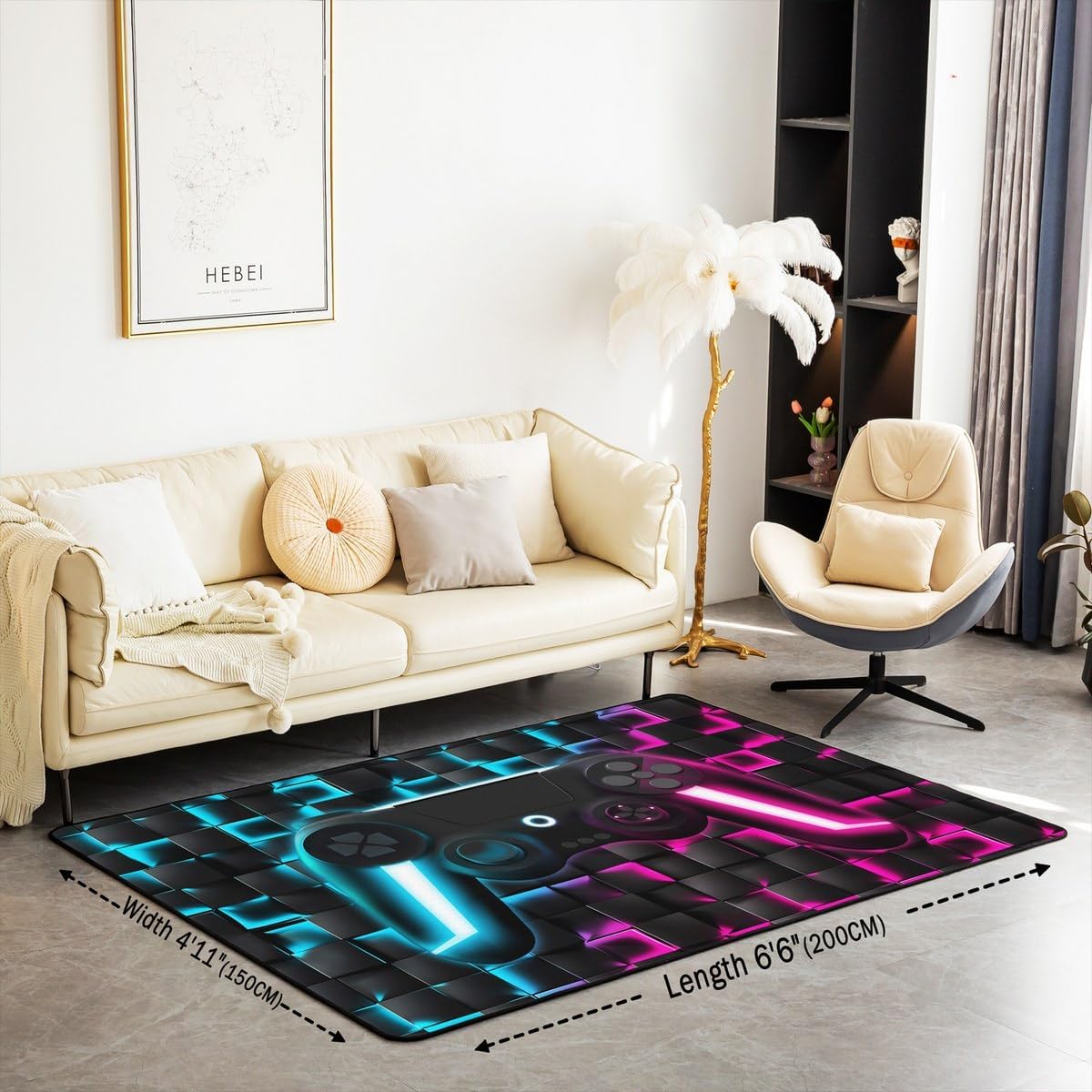 Erosebridal Boys Gamer Area Rug 5x7 Gaming Living Room Rugs for Kids Boys Teen Men Bedside Neon Lights Ombre Checkered Video Games Carpet 3D Geometric Game Console Indoor Floor Mat Blue Purple