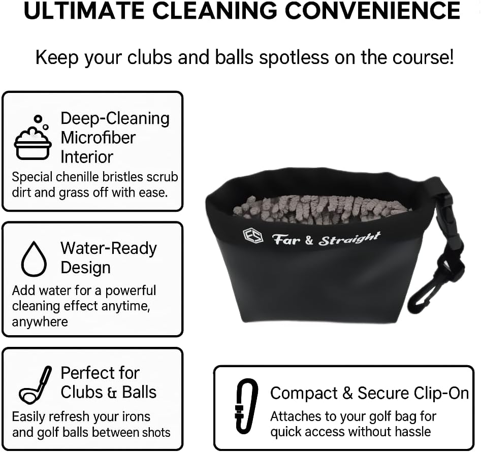 Keep your gear clean and protected with the Far & Straight Golf Cleaning Pouch , thoughtfully crafted for golfers who care about both performance and equipment care. This lightweight pouch features a soft chenille microfiber interior that effortlessly removes dirt, moisture, and debris from your clubfaces and golf balls — all while being exceptionally gentle on surfaces. The microfiber interior absorbs moisture, allowing light wet cleaning without needing a sealed liner. Designed with simplicity in mind, the pouch avoids unnecessary inner layers or stiff linings. Its single-compartment build allows for maximum flexibility and breathability, making it easy to use throughout your round without getting in the way. The open-top design allows for quick access on the go, while the detachable clip lets you secure it to your bag or belt with ease. Whether you’re teeing off or cleaning up after a bunker shot, this pouch delivers quiet, reliable cleaning power without compromising your gear’s finish.