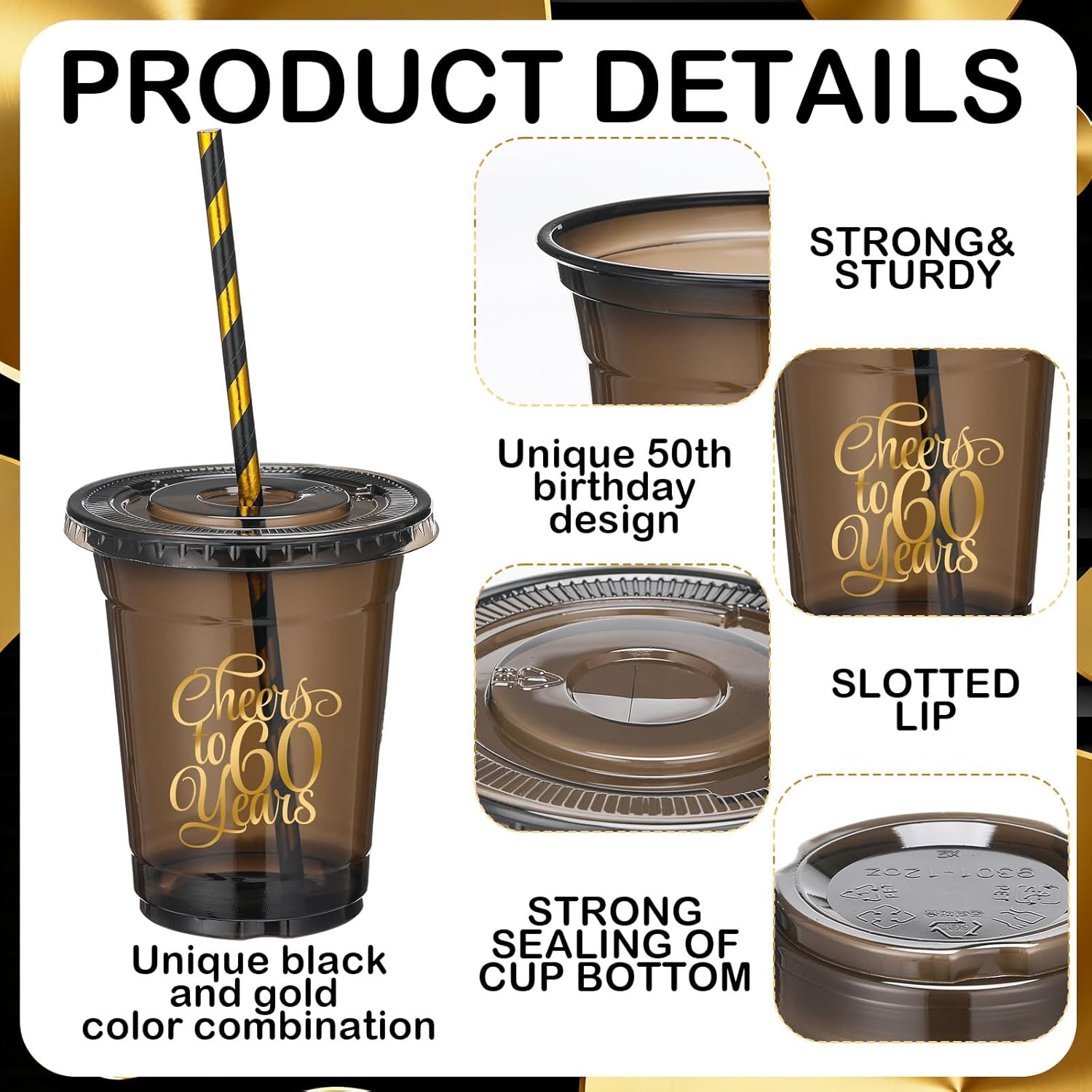 Features: Disposable Convenience: Designed for maximum convenience, these cups with lids and straws are entirely disposable. This feature allows for quick and easy cleanup after any party or event, saving valuable time and effort. Simply use them and dispose of them, making your post party chores remarkably. Elegant Party Decor: Beyond their functional purpose, these cups serve as elegant party decorations and favors. The luxurious black and gold color scheme enhances the overall ambiance of your celebration. They impress guests with their cohesive and festive design, contributing significantly to the party's theme. Specifications: Material: plastic Color: black, gold Size: Cups: 12 oz in capacity Lids: 3.66 inches/ 9.3 cm in diameter Straw: 7.68 inches/ 19.5 cm long Package includes: 50 x Birthday Cups with Lids and Paper Straw Notes: Manual measurement, please allow slight errors on size. The color may exist a slight difference due to different screen displays