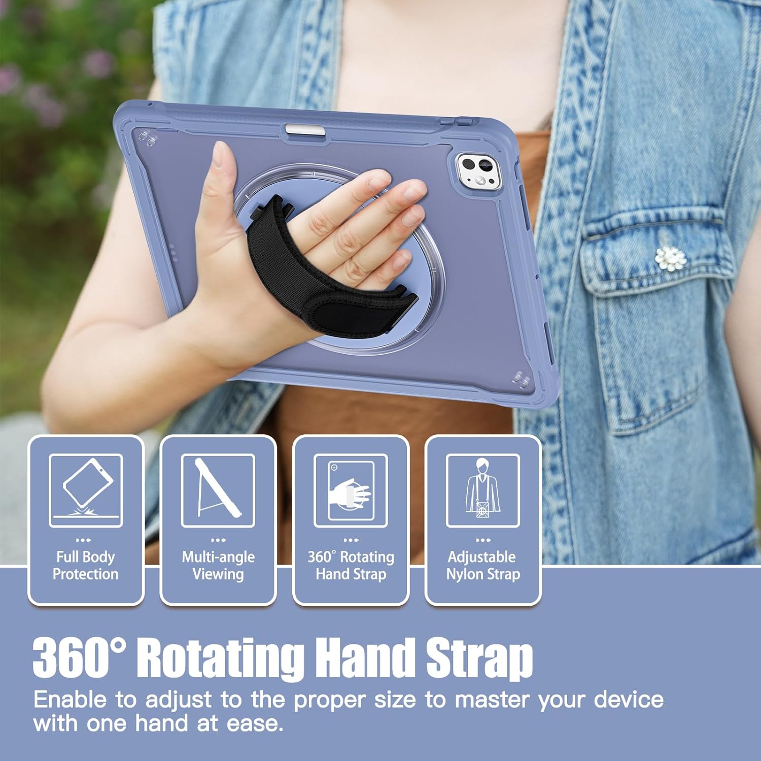 Product Description: COMPATIBILITY: ONLY for iPad Pro 13 Inch 2024 Tablet.(Model:A2925/A2926/A3007) Note: Apple Pencil Not Included! please find the model number of your tablet to prevent buying the wrong tablet case, as different cases fit different models of iPad. Features: 360° Degrees Rotatable Kickstand: The stand can be rotated 360 degrees to keep iPad standing steady at multiple angles, freeing your hands and providing a flexible and comfortable angle for viewing or typing. Ideal for indoor and outdoor work, study, entertainment, etc. Shockproof & Drop-proof: The Shockproof TPU back transparent PC case wraps the Tablet to prevent Tab drops, bumps and ground impacts, Protecting the Tab, showing its excellent safety. 360°Degree Rotation adjustable hand strap: Adjust the elasticity of the strap according to the size of the adult/kids hand. The hand strap helps to hold iPad well to prevent drops and rotate the strap for free angle viewing and use. 360° Adjustable /Detachable Shoulder Straps: Adjustable/removable shoulder strap, easy to install and remove. Easy to carry iPad case when going out to play or work/study, hands free easily, shoulder straps can be hung anywhere, can be hung behind car seats for Kids to watch videos. Package Contents: 1 x Rotating Kickstand Case for iPad Pro 13 Inch 2024 Tablet.(Model:A2925/A2926/A3007) 1 x Shoulder Strap