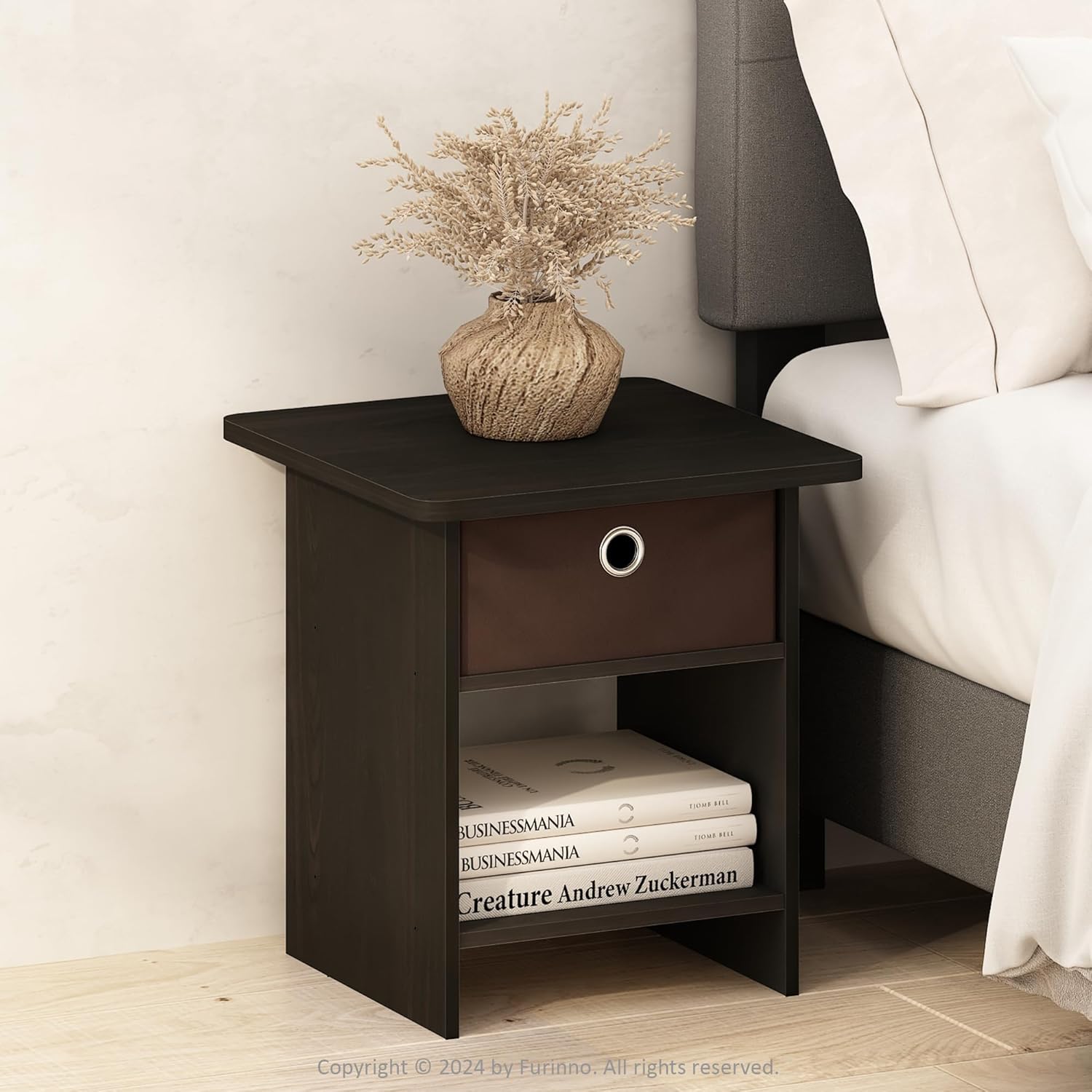 Create the prefect living room space with this FURINNO end table with bin. This end table will sit perfectly next to your chair or sofa and both beautiful and functional. Featuring one fabric drawer is perfect for keeping DVDs and remotes corralled, while an open shelf makes a marvelous spot to put a lush potted succulent on display. Rounded edge design prevents potential injuries. This storage end table is easy assembly with step by step instruction. Care instructions: wipe clean with clean damped cloth. Avoid using harsh chemicals. Pictures are for illustration purpose. All decor items are not included in this offer.