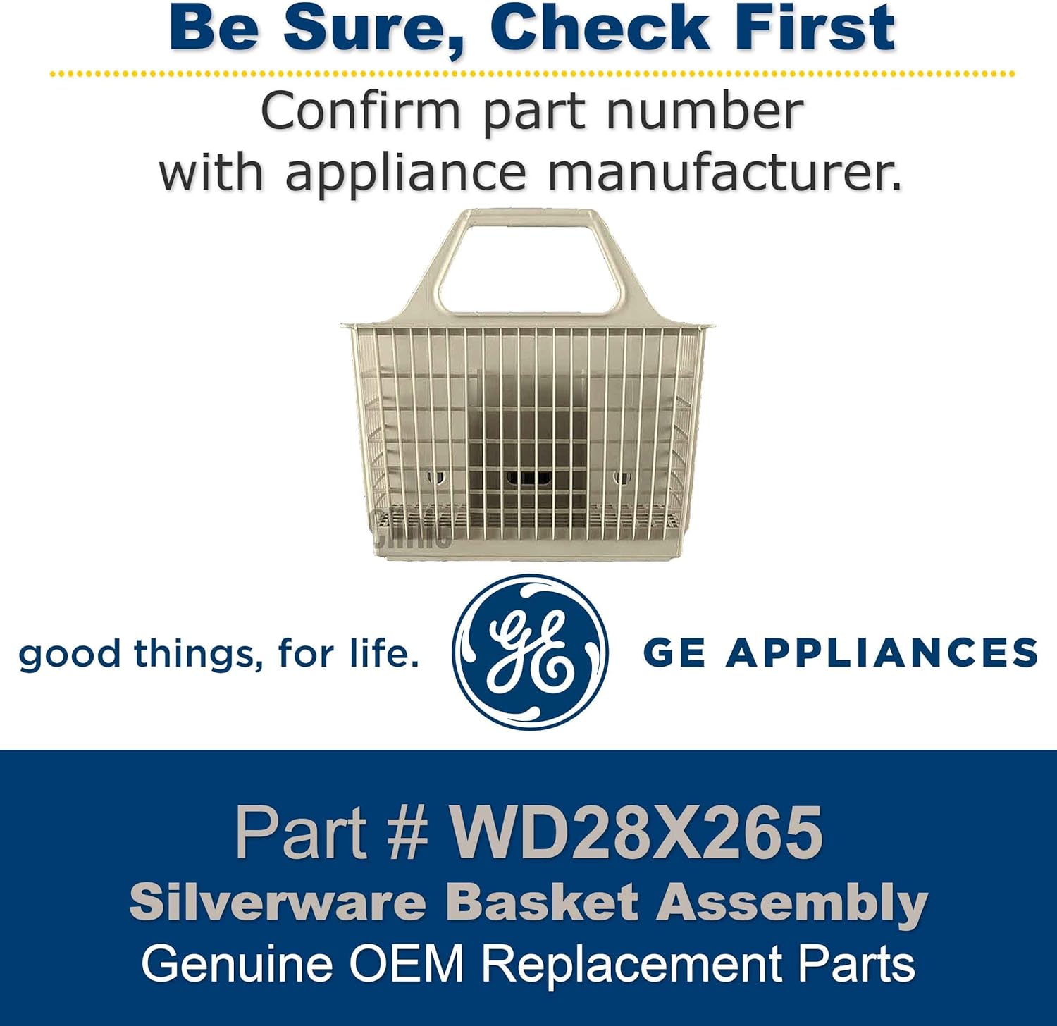 Product Description The high quality GE OEM WD28X265 Silverware Basket for conveniently storing silverware for cleaning is manufactured from high quality materials for strength and durability. Offering a long lasting product that is designed and manufactured to fit your General Electric dishwasher. From the Manufacturer The GE Dishwasher Basket WD28X265 is a GE OEM appliance repair part. One piece design. Use the GE WD28X265 to repair your GE brand dishwasher which may include General Electric, Hotpoint, Kenmore, RCA or others