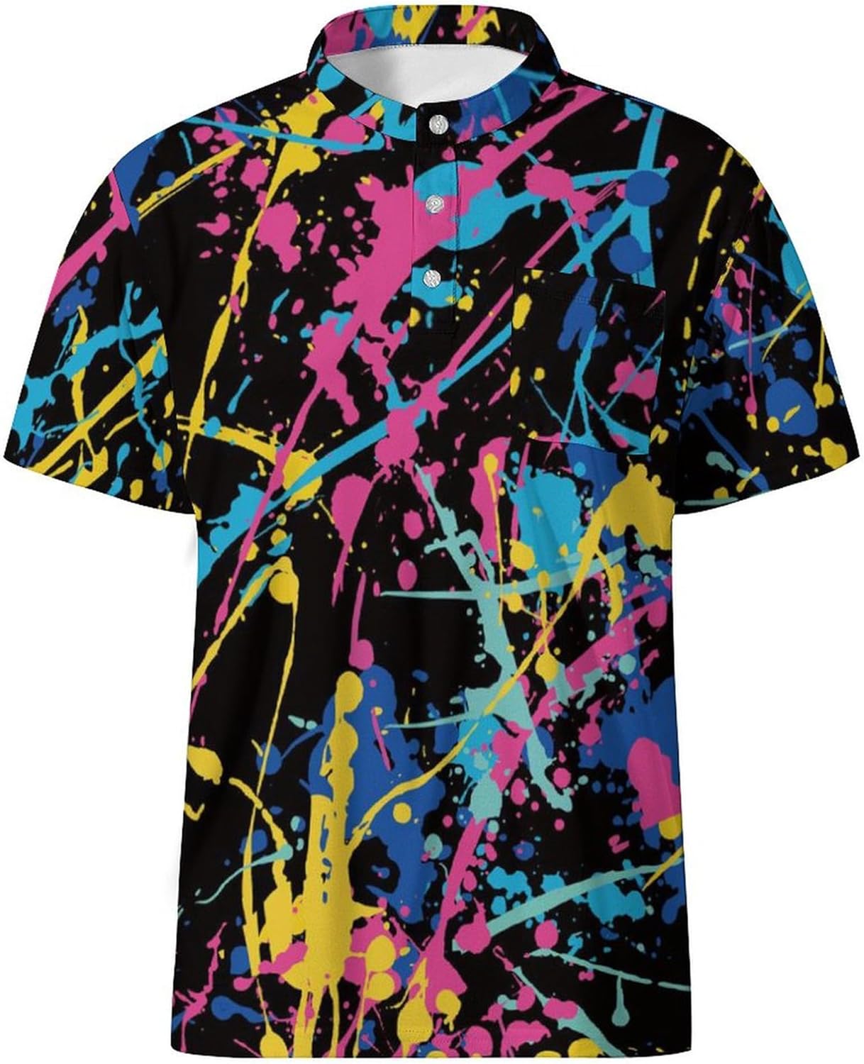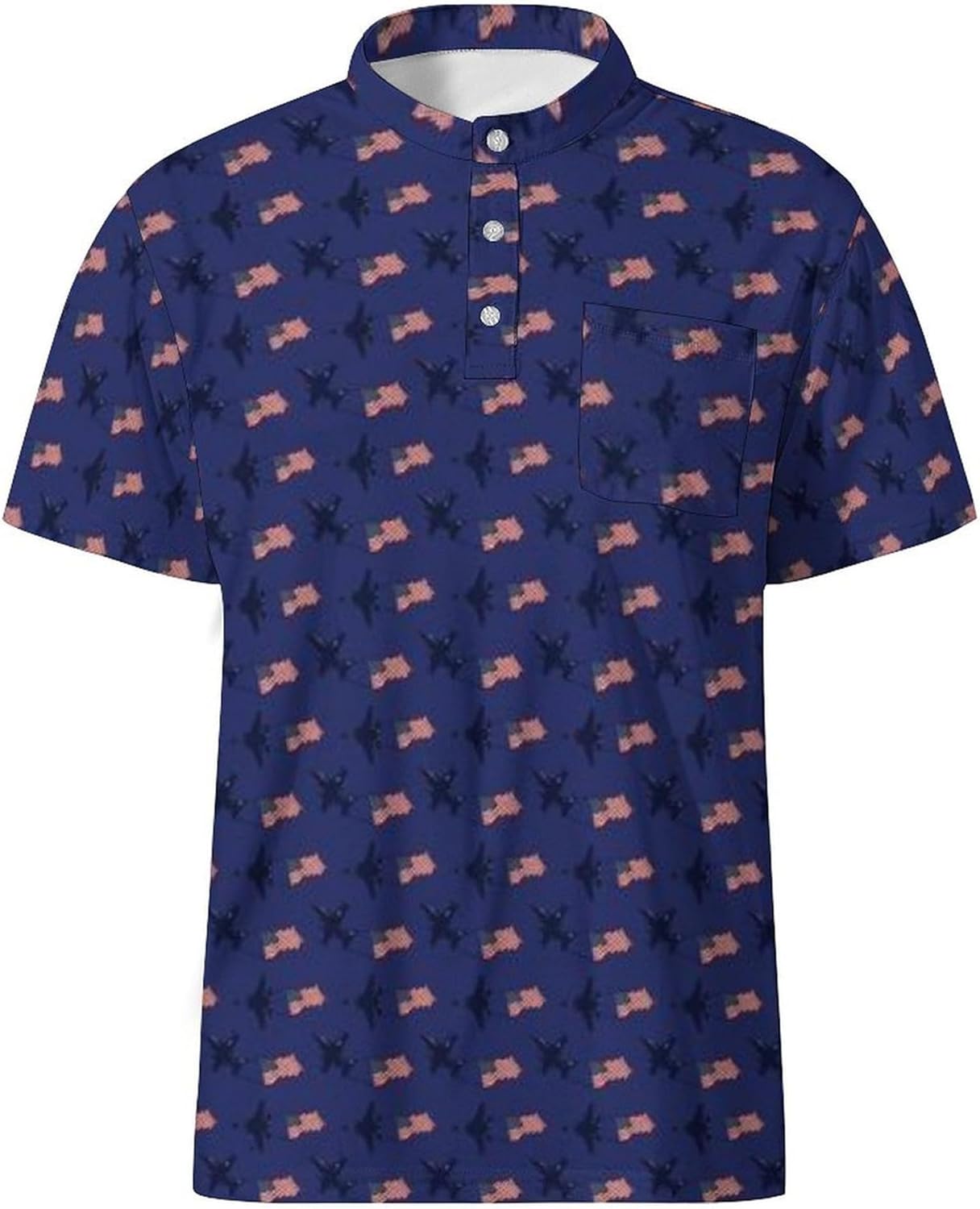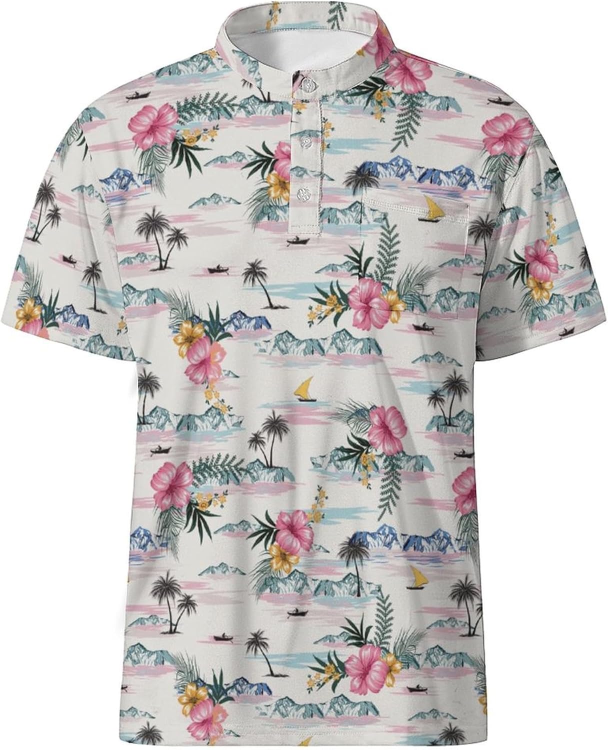 Enjoy the comfort and performance of MDLBNSI mens collarless golf shirts. Crafted from lightweight, moisture-wicking fabric, our beach golf shirts keep you cool and comfortable no matter the occasion. These quick-dry mens golf shirts are great for active lifestyles, making them ideal as workout shirts, cruise shirts, beach shirts, mens casual shirts and athletic wear. Everyone deserves great style and performance, and these no collar golf shirts deliver both! With vibrant tropical-inspired color and designs, these Hawaiian printed golf shirts for men bring a bold and eye-catching aesthetic. Featuring a unique blend of palm and natural plant leaves, joyful beach scenes and lively flamingos, they're great for turning heads whether you're lounging on the beach or strolling down the boulevard. Get ready to make a splash with this must-have addition to your summer collection! Step up your style with men's tropical collarless golf shirts featuring a classic 3-button placket for a polished look. Collarless design of these golf polos is a twist on the traditional polo that sets it apart and makes it something special. Besides looking great, the absence of a collar prevents friction and irritation in the neck area and allows you to move unrestricted. There is also a pocket in the chest place of men's golf shirt , which provides a convenient spot to store small essentials like keys, sunglasses while also enhancing the casual, laid-back aesthetic of the mens golf polos. Mens collarless polo shirts sleeve are the utility player of men's wear. You can put almost any type of casual outerwear on top of a collarless shirt and look stylish. Jean, jackets, hoodies all work well with summer polo shirts. Whether you're dressing up for a casual outing or keeping it chill for a beach day, these Hawaiian-inspired golf shirts are a must-have staple in your wardrobe.