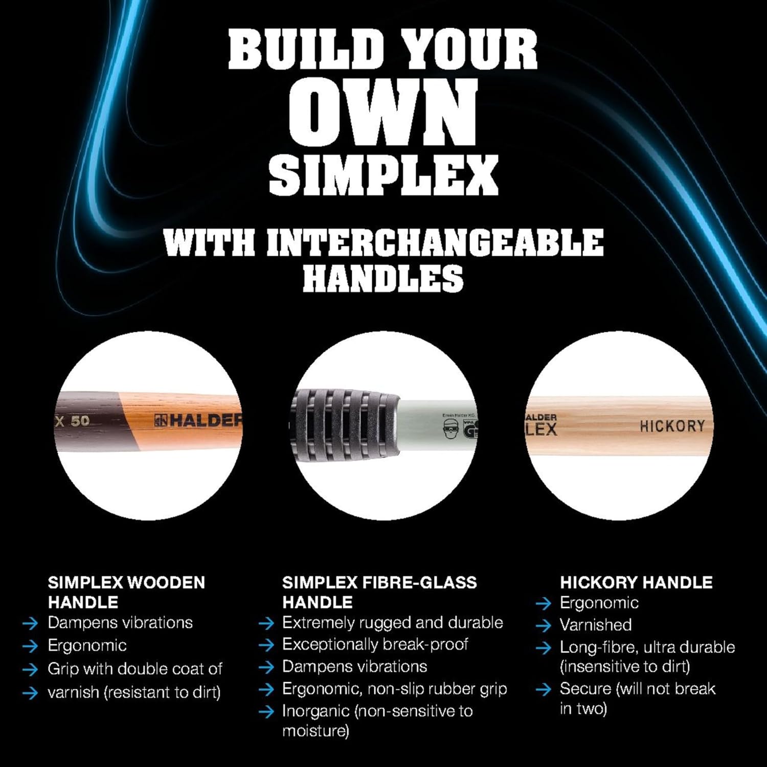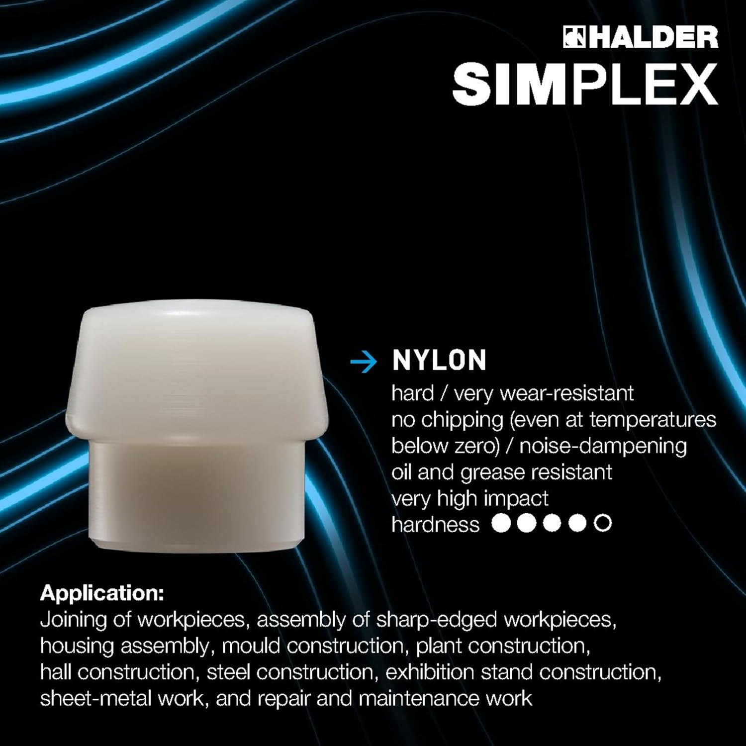 The SIMPLEX series 3708 is equipped with the nylon insert on either side. This white insert (series 3208) offers outstanding impact qualities and is guaranteed to combine maximum strength with unique durability. It is composed of extruded and extremely homogeneous material. Compared to injection molded plastic inserts, it is therefore considerably more wear-resistant and durable and will never chip even in sub-zero temperatures. Moreover, it is also oil and grease-resistant. The black, reinforced cast steel housing provides for greater stability thanks to the enlarged wall thicknesses and struts. The increase in weight ensures greater impact force. Extremely rugged and durable, the fiberglass handle offers exceptional break resistance. It is shaped ergonomically and includes a non-slip handle. It possesses a smooth surface and is inorganic (non-sensitive to moisture). In line with the smart SIMPLEX principle, all components are replaceable and can be retrofitted. This translates to savings in both money and resources.