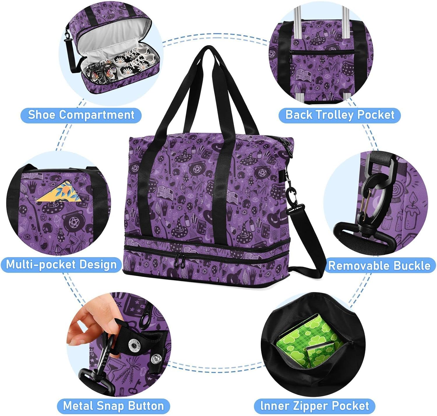 Material: This sports bag is made of durable polyester twill Tote fabric, which is durable and waterproof. Size:Bottom opening size::17.32*8.66*15.55in Bottom folded size:17.32*8.66*12.99in Size of small cosmetic bag: 7.09*3.15*5.12in Feature: 1.Wet and dry separation design: This fitness bag has a wet separation waterproof compartment, and it has an upgraded waterproof zippered PVC lined pocket that can separate your wet, dry, clean, and dirty items. Can also store shoes and toiletries 2.Dual handle and adjustable, detachable shoulder strap with comfortable padding to reduce pressure during carrying 3.Structure: There is a large and spacious main compartment,. There is also a small waterproof zippered bag inside. At the bottom, there is a moisture and dry separation waterproof barrier. An additional small cosmetic bag is included. There is also a trolley bag on the back that secures the luggage bag to the trolley case 4.Multi function: It can be used as a gym handbag and a luggage bag that can be carried on an airplane. Suitable for beaches, travel, vacations, weekend nights, gyms, pilates, or swimming pools