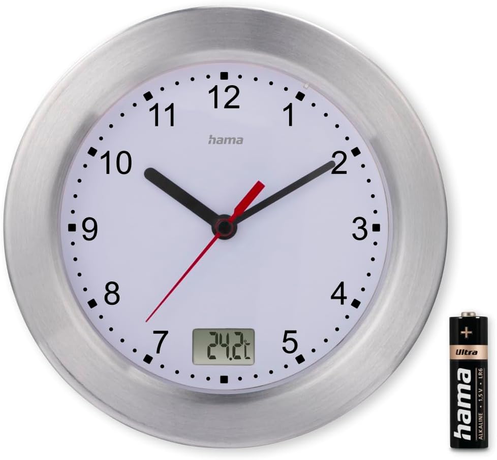 Hama Bathroom clock (bath clock with suction cup, clock with thermometer, wall clock without ticking sounds, analogue, quartz clock, analogue time display, digital temperature display, no drilling, moisture-proof) silver The modern bathroom clock with thermometer from Hama impresses with its subtle, stylish design. The brushed aluminium case blends harmoniously into any bathroom. Thanks to the hour, minute and second hands, the time on the analogue quartz clock can be read exactly at a glance. The small clock is equipped with four suction cups. So it holds securely on tiles and mirror surfaces - without drilling. In addition, the bathroom clock has a cut-out on the back where it can be hung on the wall. So the placement is flexible. The clock with thermometer measures temperatures from -20 to +50 degrees Celsius and displays them digitally. Since the wall clock does not require ticking sounds, it does not bother you even if you spend a longer time in the bathroom. Of course, the watch is protected from moisture caused by water vapour or water splashes. The box contents include the matching battery. So the watch can be used directly. Technical details: Dial colour: white. Case colour: silver. Seconds display: second hand. Cover material: glass. Design: wall clock. Special feature: low noise. Operating mode: Manual Display: analogue, digital. Housing material: brushed aluminium. Additional functions: suction cups, thermometer (-20°C to +50°C). Diameter: 17 cm. Weight: 355 g Depth: 5 cm. Number of batteries: 1. Battery type: AA Mignon. Consumer note: Thanks to the creeping second hand, no ticking sounds are audible, the movement is easy to hear by quiet whiring.