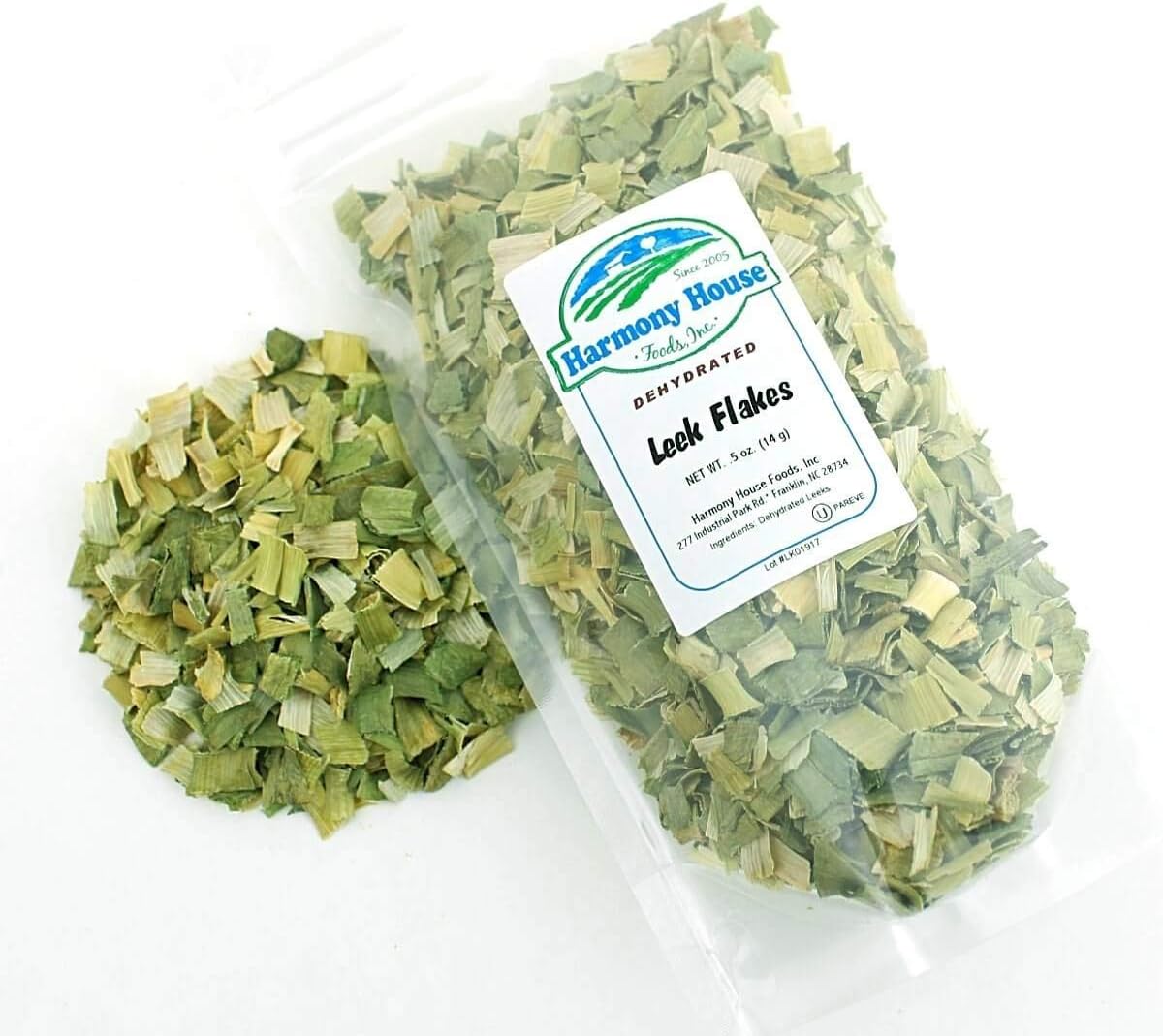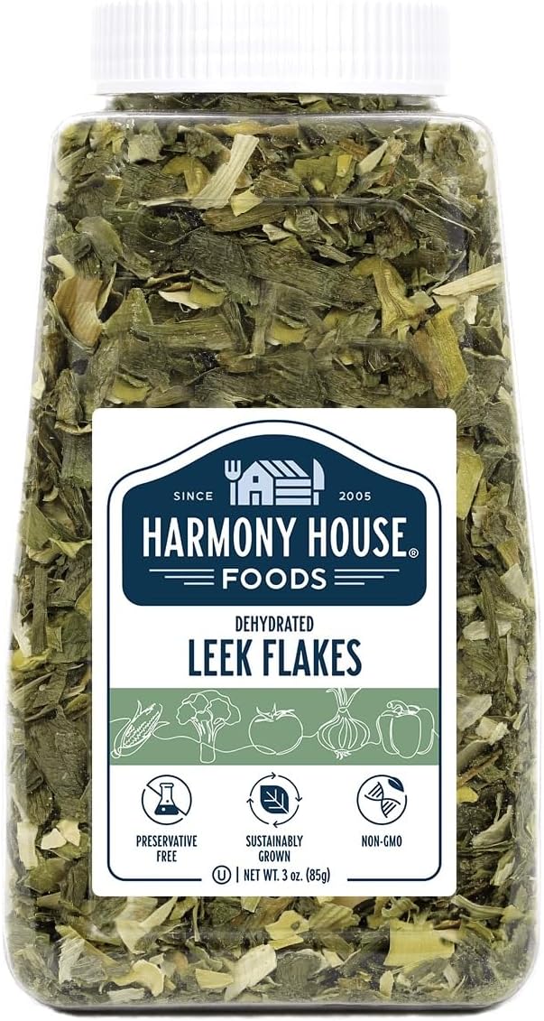 Eating your veggies has never been so easy - or delicious!Our dried leek flakes are ready to cook whenever you are feeling hungry! More delicious than conventional frozen or canned options, our dried vegetables don’t require any boiling, chopping, shredding, slicing, or dicing, so you can save time when you are in a hurry. Mix our dried leek flakes into your favorite pasta sauce recipe, make your own creamy leek and potato soup, throw them into a casserole with green beans and scallions, or saute with bell peppers, shallots, herbs, and the seasonings of your choice for a mouthwatering side dish in just minutes. Our bulk leek flakes don’t contain any seasoning powders or spices, can be stored for up to 2 years while still maintaining maximum freshness, and are great to take with you on camping trips, for stocking your emergency supply kit, or just for keeping in your pantry at home.Freshness you can see, quality you can tasteWe believe you deserve the opportunity to taste the best fruits and vegetables that mother earth has to offer. That’s why we never hide our dehydrated foods behind mysterious cans or colored bags. Our clear, BPA-free resealable containers and pouches allow the quality of our products to shine through while locking in freshness for years to come. Our air dried and freeze dried whole foods are always non-GMO, gluten-free and kosher OU, and we never add artificial ingredients, preservatives, flavors, or dyes to any of our products.About Harmony House FoodsHarmony House Foods, Inc. is a family-owned and operated business in Western North Carolina with a dream of delivering high-quality, shelf-stable vegetarian and vegan foods and a passion for product education and impeccable customer service. We are proud to provide our customers with ethical, sustainable products with a freshness you can see and taste.