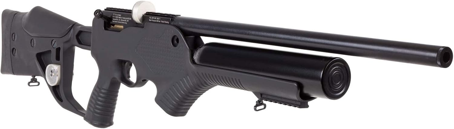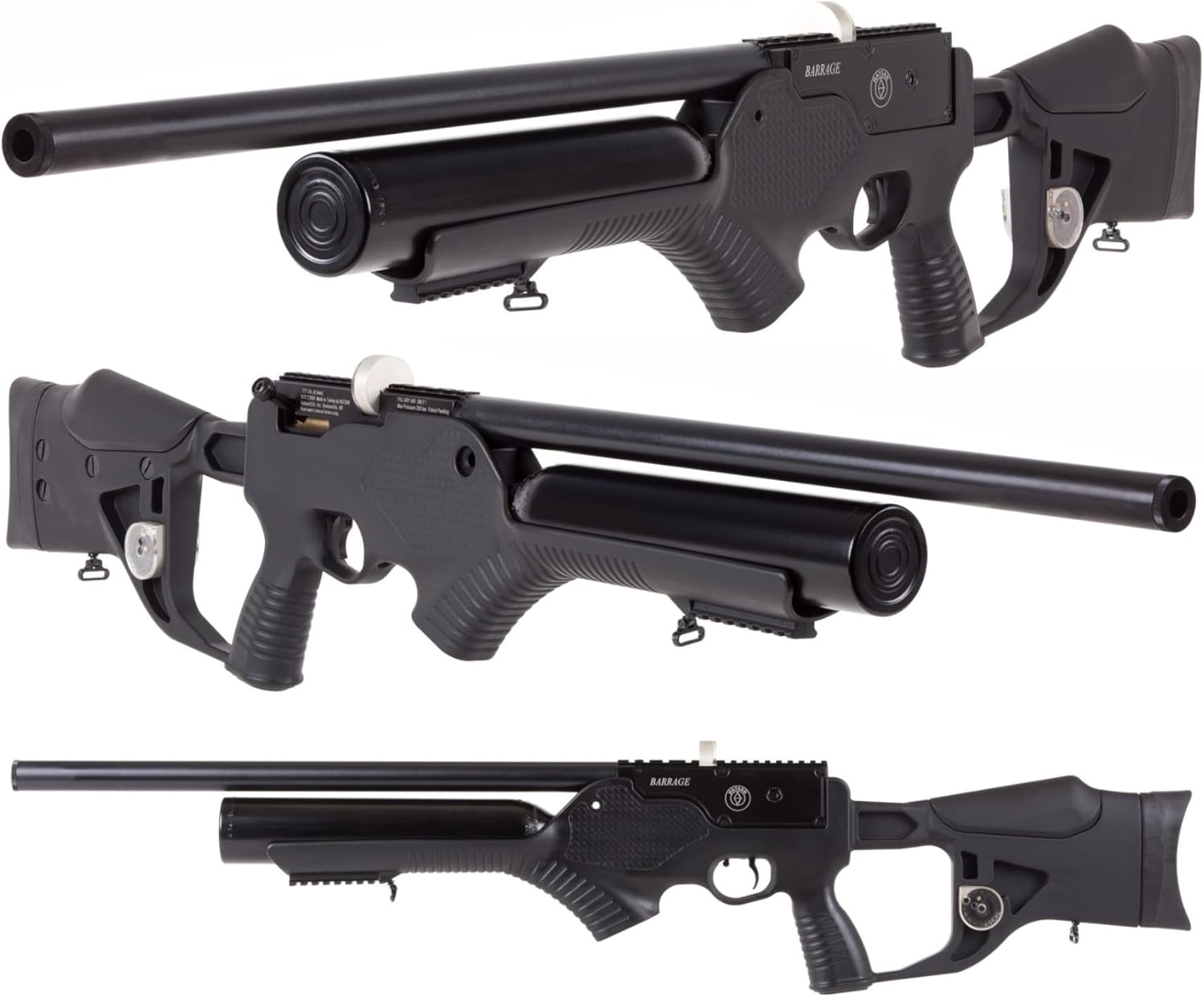 The Hatsan Barrage Semi Auto PCP Air RifleIdeal for small game hunters and target shooters, the Barrage is capable of firing as fast as you can pull the trigger. This semi-automatic's speed is due to the air gun's unique gas operated action (as opposed to electrical) which adds greater reliability and longevity than other repeating PCPs on the market. With a fully shrouded barrel, the Barrage keeps shots quiet for backyard target shooters and small game hunters. KEY FEATURES: Semi-Automatic Action Fully Shrouded, Precision Rifled and Choked Barrel Large 500cc Bottle Provides More Shots Per Fill Combo Scope Rail (11mm and 22mm) Spring-Loaded Rotary Magazine SPECS: Caliber: .177 / .22 / .25 Max Velocity (Lead-Free Pellets): .177 – 1,200 FPS; .22 – 1,100 FPS; .25 – 900 FPS Max Velocity (Lead Pellets): .177 – 1,100 FPS; .22 – 1,000 FPS; .25 – 900 FPS Max Energy: .177 – 23 FPE; .22 – 34 FPE; .25 – 38 FPE Shots At Optimal Velocity: .177 – 100; .22 – 120; .25 – 120 Stock: Advanced polymer, pistol grip, elevation adjustable combo, adjustable butt pad. One fore stock accessory rail. Loudness: 3-Medium Suggested for: Small game hunting/target practice Action: Semiautomatic Powerplant: Pre-charged pneumatic Weight: 10.1 lbs. Enjoy!
