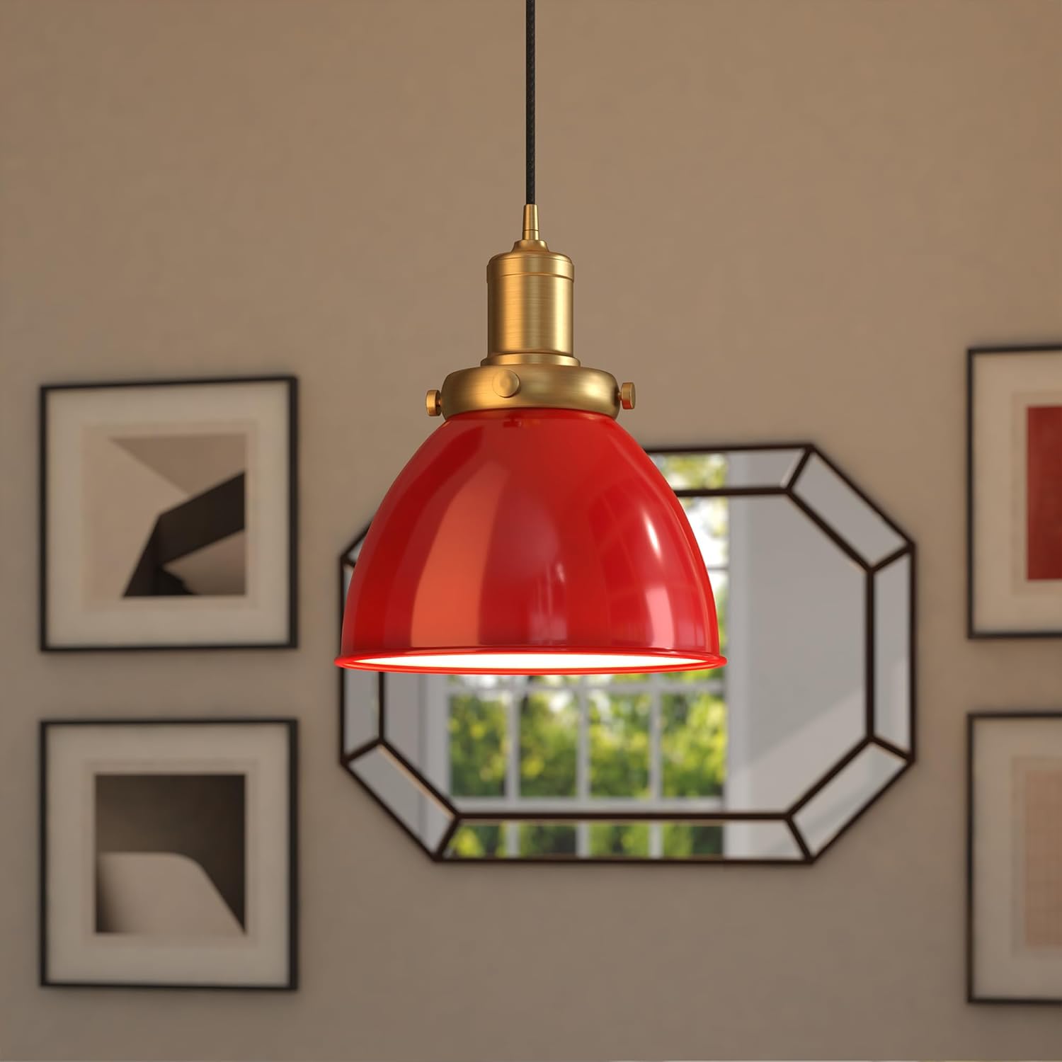 Energize your space with bold, industrial flair using the Henn&Hart 8-inch Pendant Light in Coral Red and Brass. This striking fixture combines a vibrant Coral Red metal dome shade with warm, lustrous brass accents and exposed screw details, creating a captivating two-tone statement. The handcrafted red finish makes a dramatic pop of color, while the brass elements add a touch of sophisticated warmth. Inspired by nautical hardware, its design blends rugged character with modern, high-impact style. The 8-inch shade provides an ideal mix of focused task lighting and ambient glow, perfect for a kitchen island, dining area, or game room bar. With an 8-foot adjustable cord for customizable height and compatibility with dimmers and standard bulbs, this pendant is a vibrant and versatile focal point that commands attention in any setting.