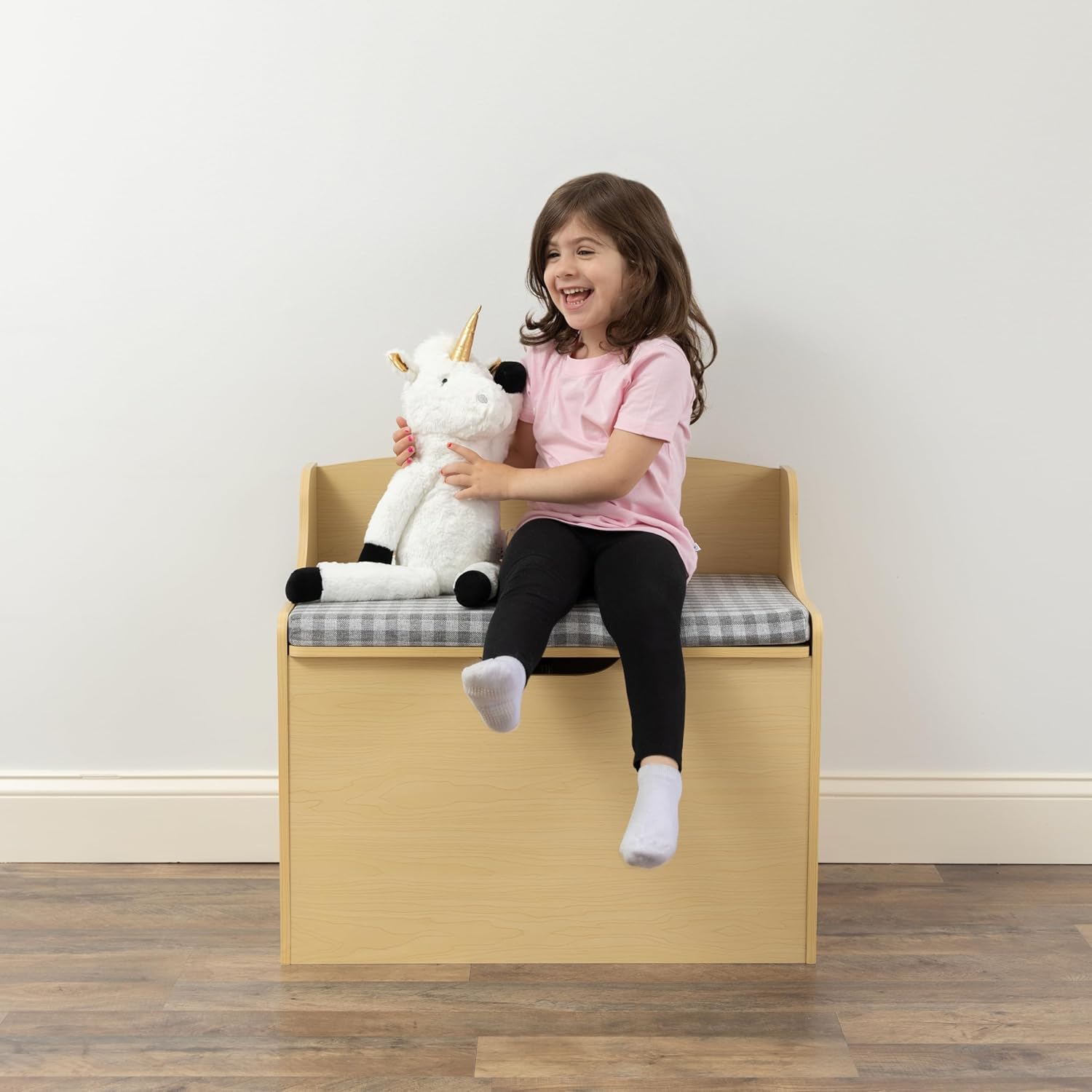 Timeless, practical, and safe, the Humble Crew Jaime Hinged Toy Storage Chest with Removable Cushion is the perfect solution for stylish toy storage and cozy seating in one. Crafted from durable engineered wood with a natural finish, this large toy chest offers a deep compartment ideal for organizing stuffed animals, balls, books, and more. Whether you're setting up a bedroom, playroom, or shared family space, its classic look and functionality make it a family favorite.