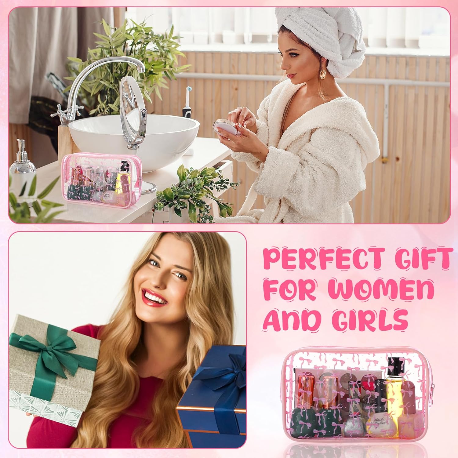 Features: These versatile bags serve multiple purposes, from grocery storage to makeup organization, making them ideal for various occasions. Use them as cosmetic bags, toiletry organizers, travel pouches, or even as storage bags for your daily essentials. Their practical design makes them ideal for everyday use Our coquette preppy bags are transparent and decorated with pink bow patterns, more cute and fashionable design, you can easily carry them to anywhere you want Specifications: Material: PVC Color: clear Size: 7 x 4.72 inches / 18 x 12 cm Package includes: 24 x Pink Bow Clear Cosmetics Bag Notes: Manual measurement, please allow slight errors on size. The color may exist a slight difference due to different screen displays.