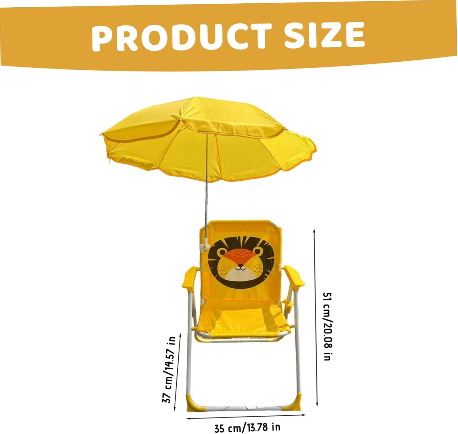 Description: Kids Beach Chair with Umbrella, Foldable & Detachable Portable Oxford Cloth Cute Kids Beach Chair with Canopy for Outdoor Summer perfectly combines comfort, portability, and sun protection for children during adventures; featuring a detachable umbrella canopy for excellent shade and UV defense, this kids beach chair with canopy shade is crafted from stable, breathable Oxford cloth to keep kids comfortable on hot days, while its foldable design and lightweight frame make it easy to carry and store for trips to the beach, park, or camping; specially sized and designed with a cute appearance for children, this chair with umbrella and shade is ideal for outdoor summer use, including lawn relaxation, picnics, or camping, ensuring safe, comfortable seating wherever your kids play. Features:. Kids Beach Chair. -Color: Yellow. -Material: Metal, Oxford Cloth. -Size: about 35x37x51 cm/13.78x14.57x20.08 inch. Note:Manual measurement, please allow slight errors on size.The colors may exist slight difference due to different screens. Package Including 1 x Kids Beach Chair