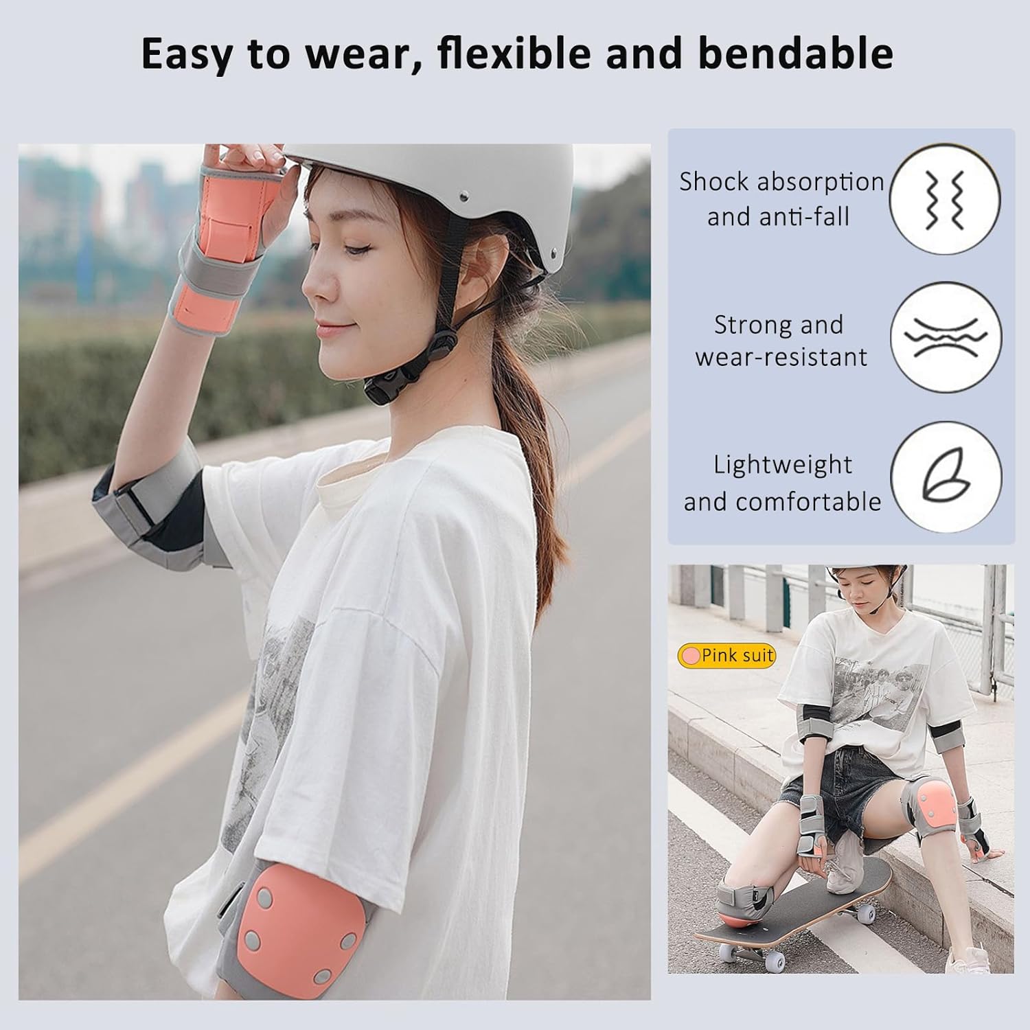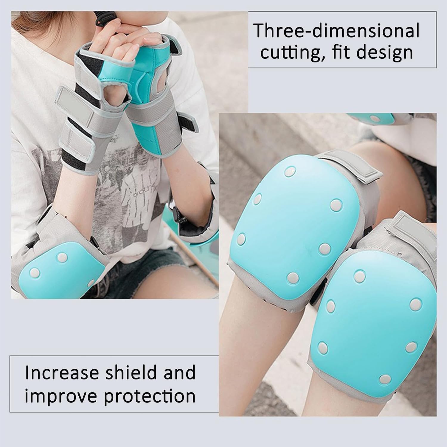 Name: 6-piece set of protective gear for children and adults Category: Combination sports protective gear Protective parts: palms, wrists, knees color: Black 6-piece set, Lake blue 6-piece set, Sakura pink 6-piece set Product size: S; M; L; XL Product weight: S: 415g / M: 515g / L: 550g / XL: 700g Suitable weight: S (15~40Kg), M (40~65Kg), L (65~85Kg), XL (80~100Kg) Suitable age: S (under 155cm) M (under 165cm) L (under 175) Applicable people: general Main material: sponge Material composition: PE 30%. Polyester 40%. Velvet 10%. Rubber band 15%, others 5% Characteristics: The shell has good hardness, the sponge thickness is moderate, the product is light in weight, the shape is good, the air permeability is good, the pressure resistance and impact resistance effectively play a protective role. Applicable sports: skateboarding, roller skating, skiing Applicable scenarios: running, fitness and beauty, sports trends, cycling, ice and snow sports, extreme challenges, hiking and camping, sports protective gear accessories. packing list: Knee pads*2 Wristband*2 Handguard*2