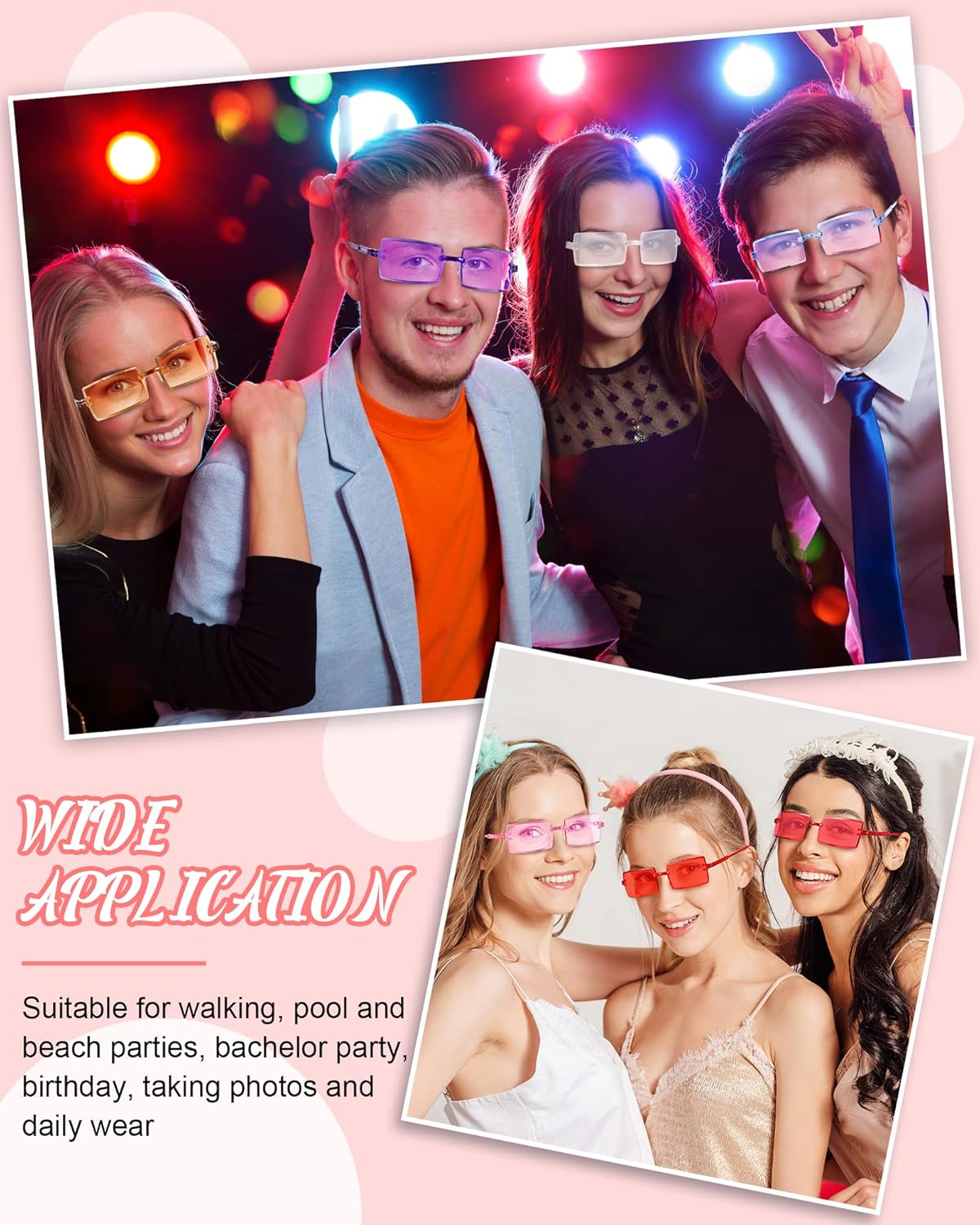 Features: The frameless sunglasses are exquisite and thoughtful gifts to your family members, friends, relatives, colleagues and other people, to show them that you care about them and strengthen your relationships. The candy color rimless sunglasses can easily put into your pocket, backpack, tote bag, jewelry box or other places, without taking up too much space, easy to carry, providing you a lot of convenience. Specifications: Material: PC materialsColor: classic colorsSize: one sizeLens: about 2.24 inches long and 1.5 inches wideLegs: about 5.43 inches longNose bridge: about 0.8 inches longPackage includes: 36 Pairs frameless rectangle sunglassesNotes: Manual measurement, please allow slight errors on size. The color may exist a slight difference due to different screen displays.