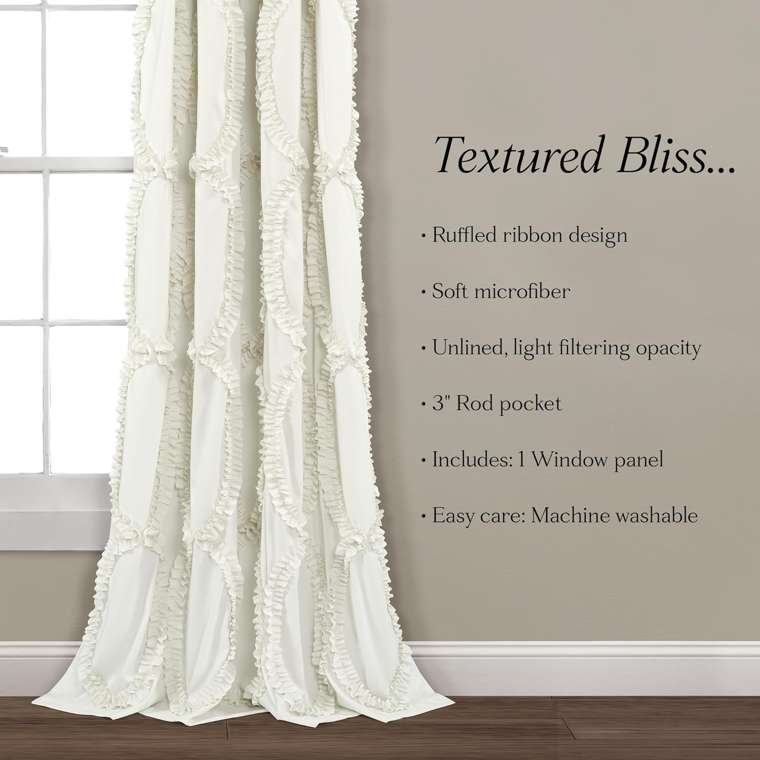 Our Avon Window Curtain Panel showcases an all-over ruffle ribbon pattern that creates a feminine look with three-dimensional texture. These farmhouse curtains would make a beautiful statement in any room in the home.Avon window panel showcases all over ruffle embroidery pattern that creates three dimensional texture. These elegant detailed window curtains are a fashionable way to style your windows. They have a texture that is one-of-a-kind and very appealing. These charming curtains let in plenty of sunlight while still providing some privacy, creating a warm and welcoming atmosphere. This ruffle curtain measures 54 inches across and is crafted from soft microfiber, sold as one single unlined window panel. Add this fabulous panel to your bedroom, living room, dining room or even nursery windows. The solid colors make them easy to style with your existing decor. This curtains set offers seamless installation with its 3" rod pocket, allowing you to easily slide it onto your curtain rod, or give the illusion of longer curtains, using clip rings (not included). We have enhanced our products for your health and well-being. This item is STANDARD 100 by OEKO-TEX certified, which means the fabric, dye and all components have been tested in an independent laboratory and certified against a list of more than 350 harmful substances. This window curtain offers easy maintenance, simply machine wash cold on gentle cycle and tumble dry on low. If needed use non-chlorine bleach for cleaning or an iron on low heat to release wrinkles. Please refer to label for full care instructions.